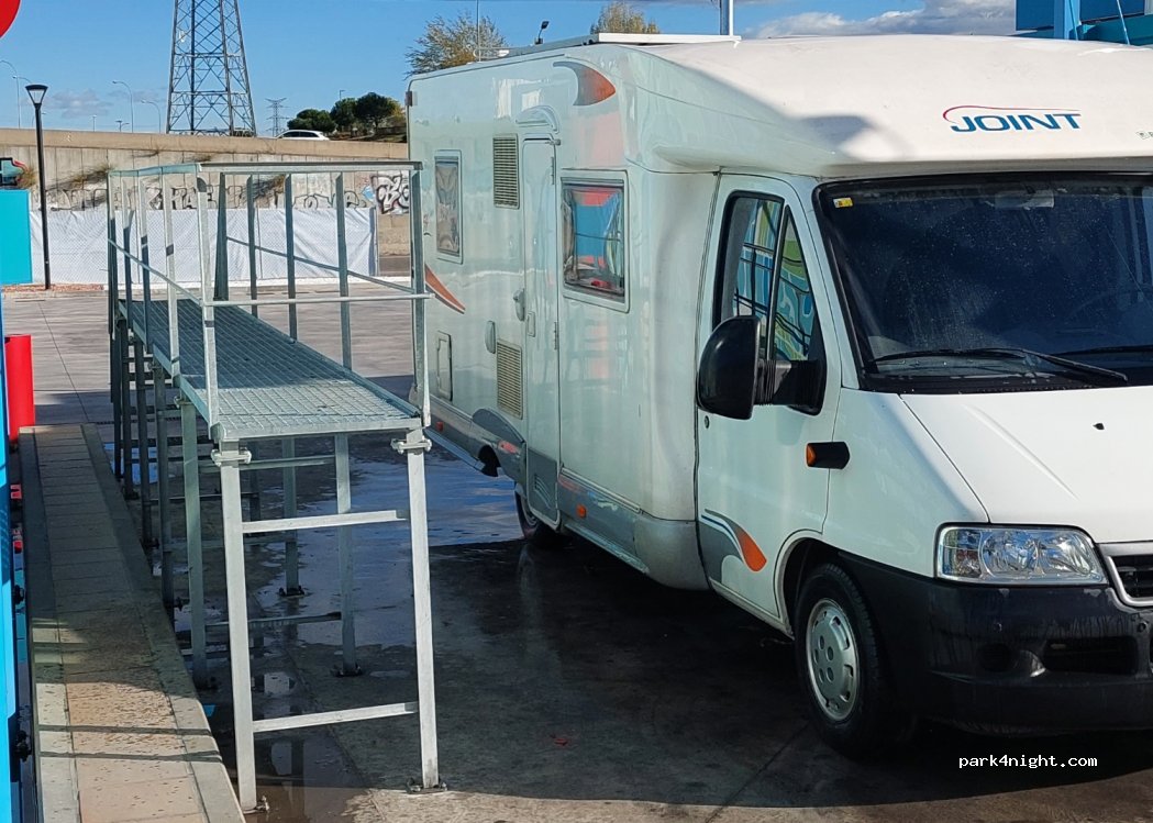 Lavadero para autocaravanas con pasarela que ayuda a llegar a la parte alta de la auto, aunque para lavar el techo es un poco complicado yo me he tenido que subir a la barandilla para alcanzar.