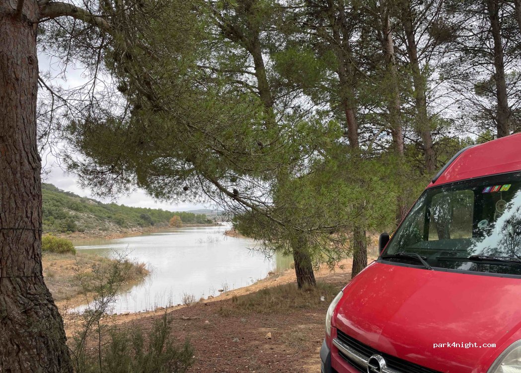Parking 50m from the lake under coniferous trees. Very nice, quiet and clean (low season). Picnic tables and trash cans are also provided. A bit bumpy path, but doable.