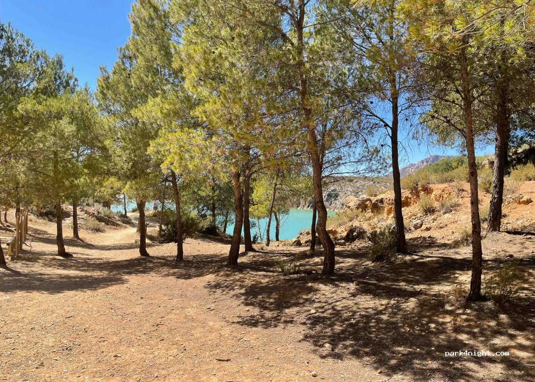 Parkplätze 50m vom See entfernt unter Nadelbäumen. Sehr schön ruhig und sauber (Nebensaison). Auch sind Picknicktische und Mülleimer vorhanden. Etwas holpriger Weg, aber gut machbar.