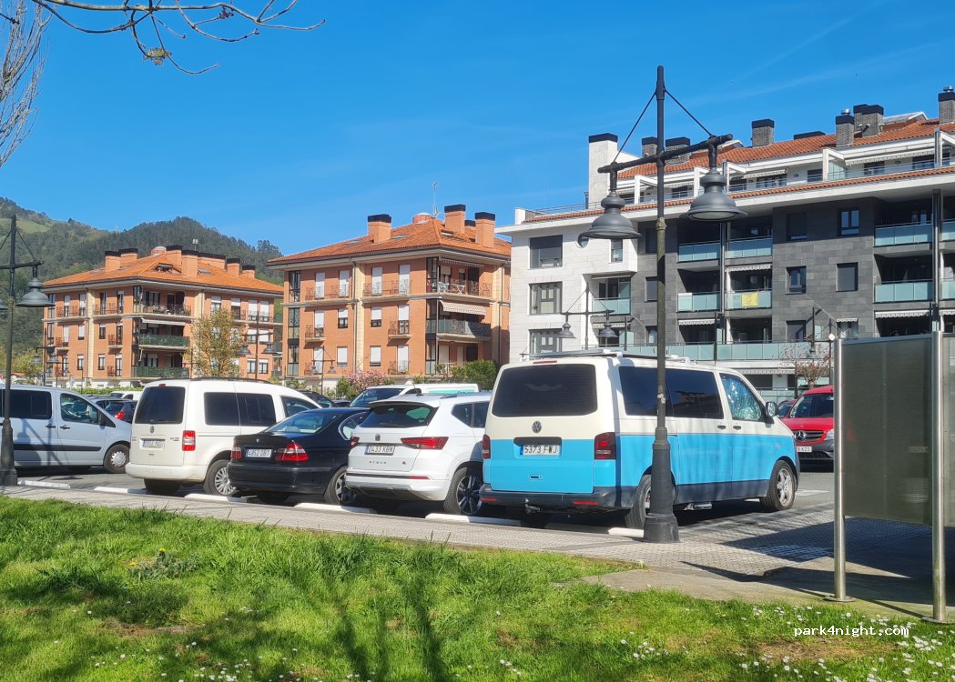 Large public car park next to the estuary promenade, a playground and an Eroski. Spacious with many seats and several vans sleeping. We spent a quiet night from Saturday to Sunday. Public toilets on one side