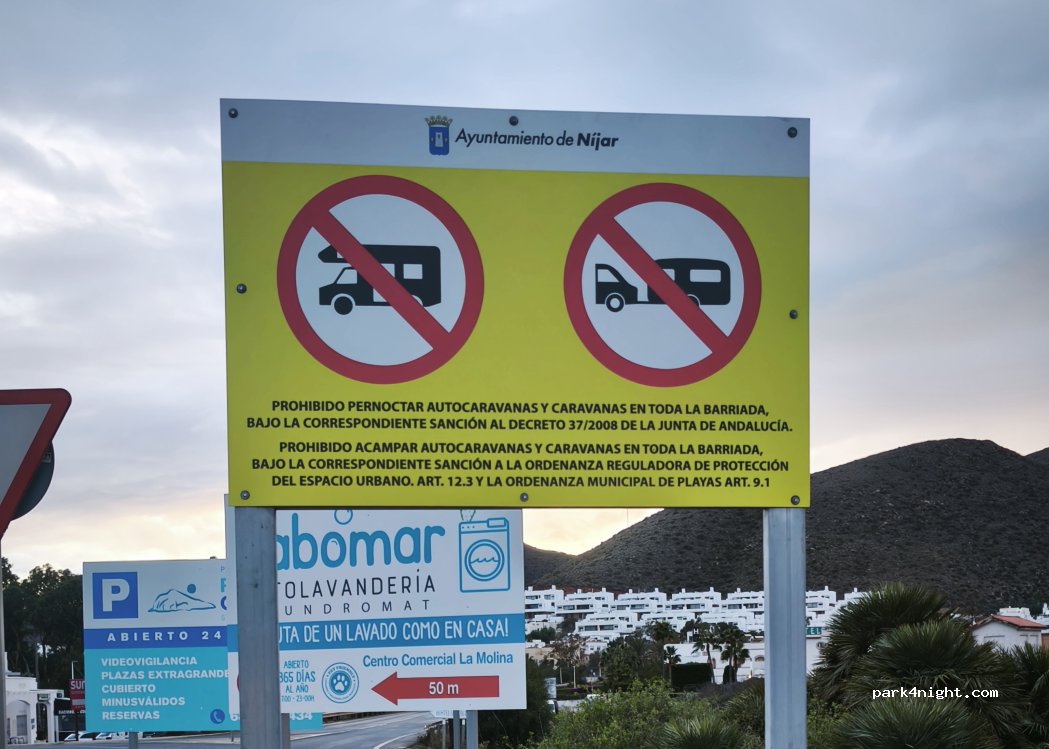 A la entrada del pueblo hay una señal de prohibido pernoctar. Aún así algunas autocaravanas se quedan. No nos arriesgamos y nos vamos. Está muy difícil pernoctar en toda la zona del cabo de gata. Está prohibida la pernocta fuera de áreas, campings o sitios habilitados.