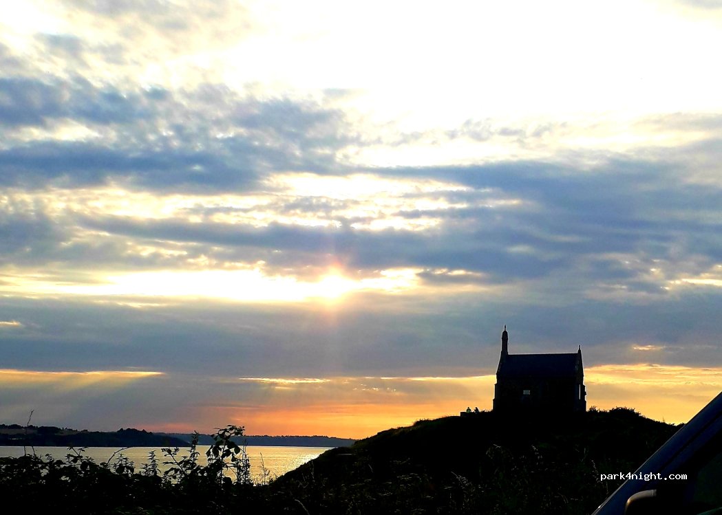 Très bon spot avec de la place et des tables à côté pour manger, nuit très calme. L’odeur n’est pas toujours agréable du aux algues vertes mais n’empêche pas de passer une très bonne soirée avec en plus un très beau coucher de soleil à regarder à coté de la chapelle !
