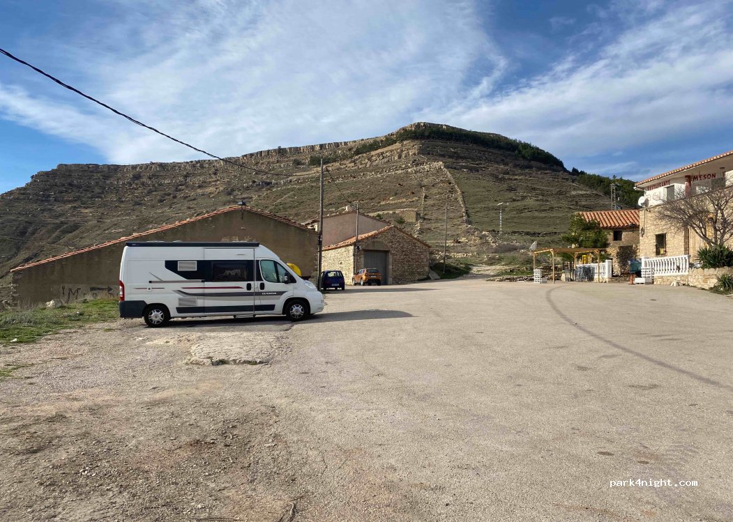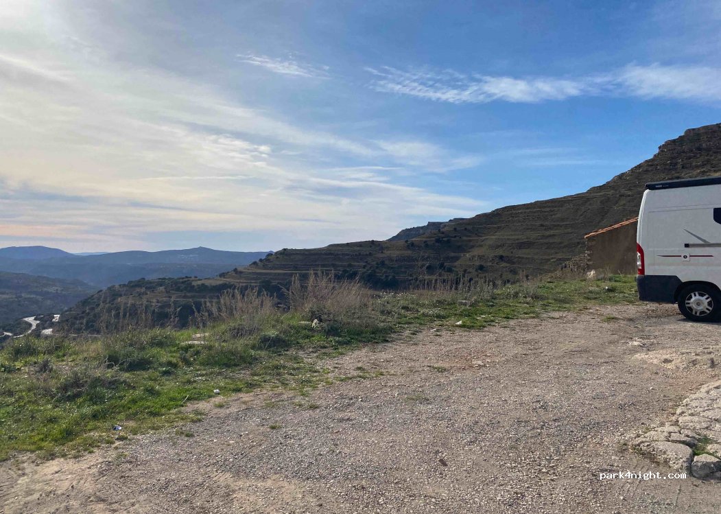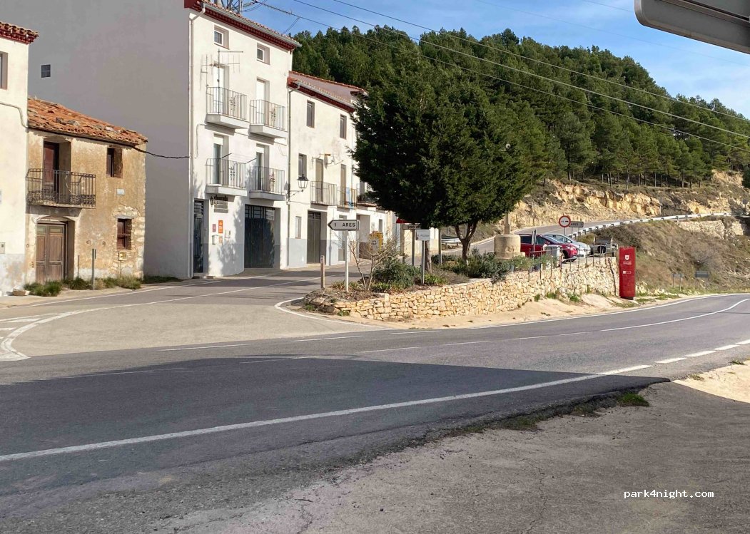 Spacious place next to a restaurant just before the entrance road to Ares del Maestre (you cannot park in the town itself, it is impossible, only cars fit and the only spacious one that there is has a private plot) There is some unevenness. The road with traffic during the day but quiet at night. Nice views and quiet at least on these dates.