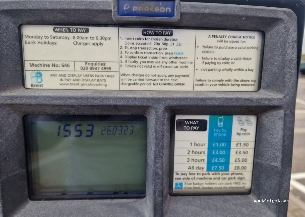 Handy car park for visiting London. £7.50 all day, free 6.30pm to 8am, no height restrictions. Queen's Park tube station 2 minutes away, 20 minute ride into center.