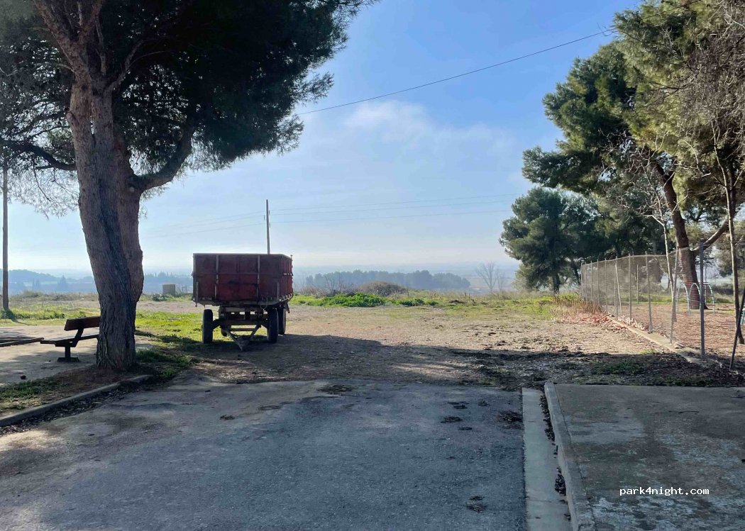 Il n'y a pas de services pour vidange, ni eau, ni électricité,ni poubelles. Situé près du parc cloturé pour jeux d'enfants , de 2 terrains de boule et à proximité du terrain de football. Espace spacieux, relativement propre,avec une belle vue dégagée au fond. Convient pour une nuit au calme en dépannage ,facile d'accès pour tout gabarits: nous y étions un jeudi soir hors vacances scolaires.