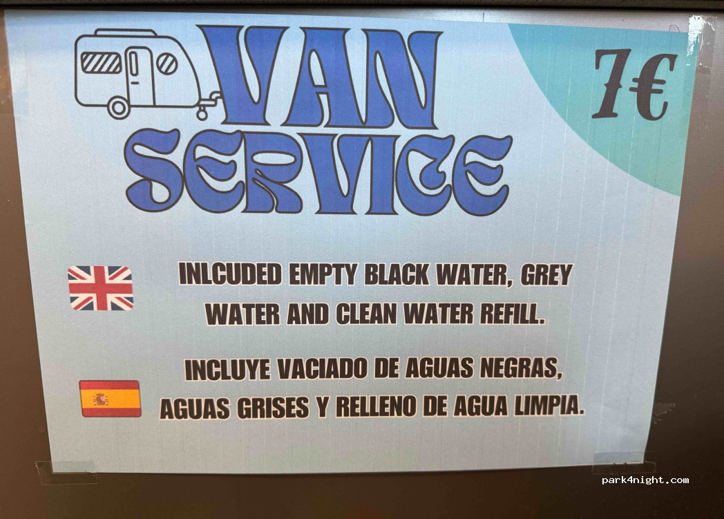 very busy place. there are no parking spaces, only one spot for a camper, if it is occupied, you have to wait, but there is actually no place to wait, even outside. the service is nice, but emptying the black water cassette means throwing it into a hole, there is no professional infrastructure. If you can, go to the service center near El Medano