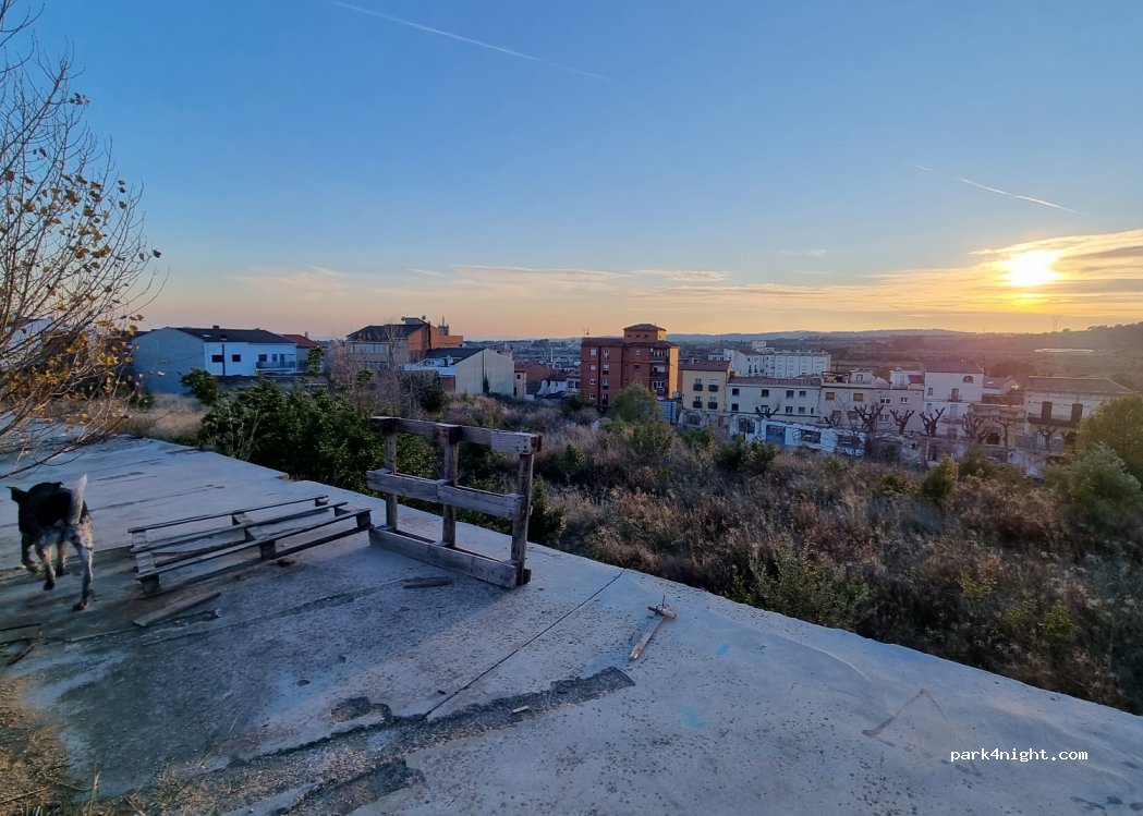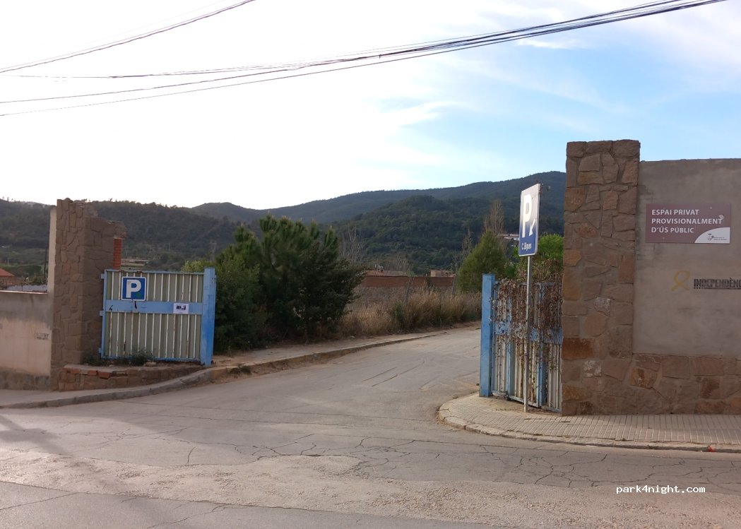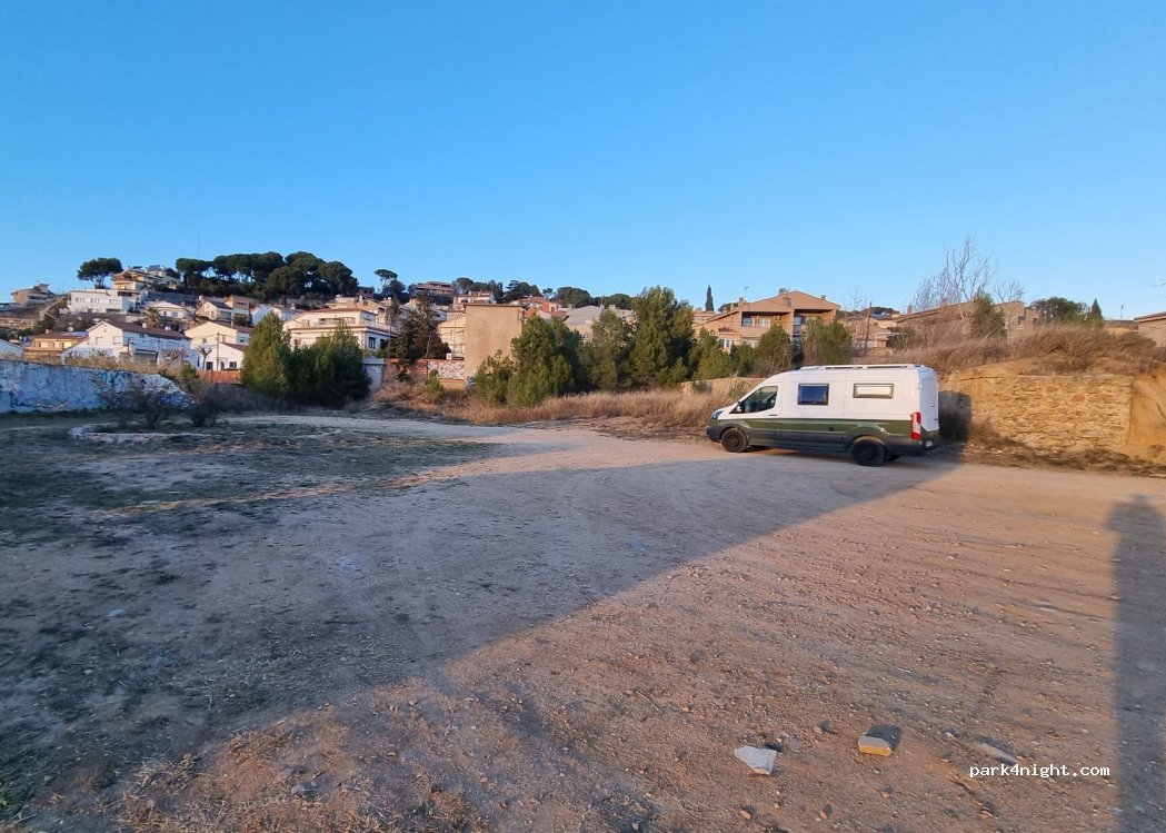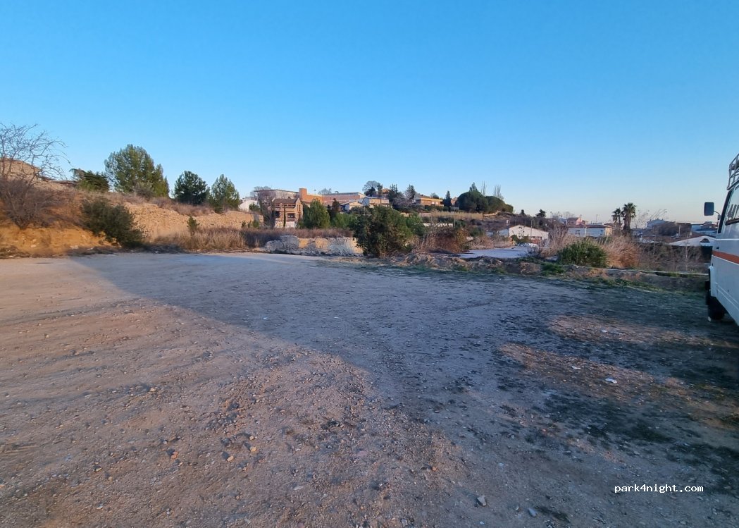 Aparcament municipal de terra, de dos nivells. Els clots i deixalles són abundants. El primer sempre ple de cotxes. El segón poc ocupat. És proper al poble, però al capvespre parelles necessitades de sexe, drogoaddictes i camells, són els veïns del segón nivell. Hem fet nit i no ens han molestat, tret d'algunes converses a veu una mica alta i el soroll propi dels vehicles.