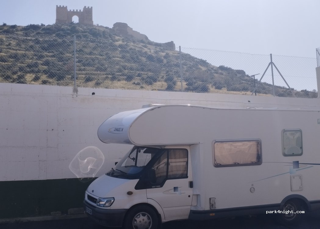 Ubicado justo al lado de la cuesta que sube al Castillo, desde donde se aprecian unas vistas espectaculares del desierto de Tabernas. Nos vino genial para estacionar la AC y almorzar. No lo recomiendo para pernoctar.
