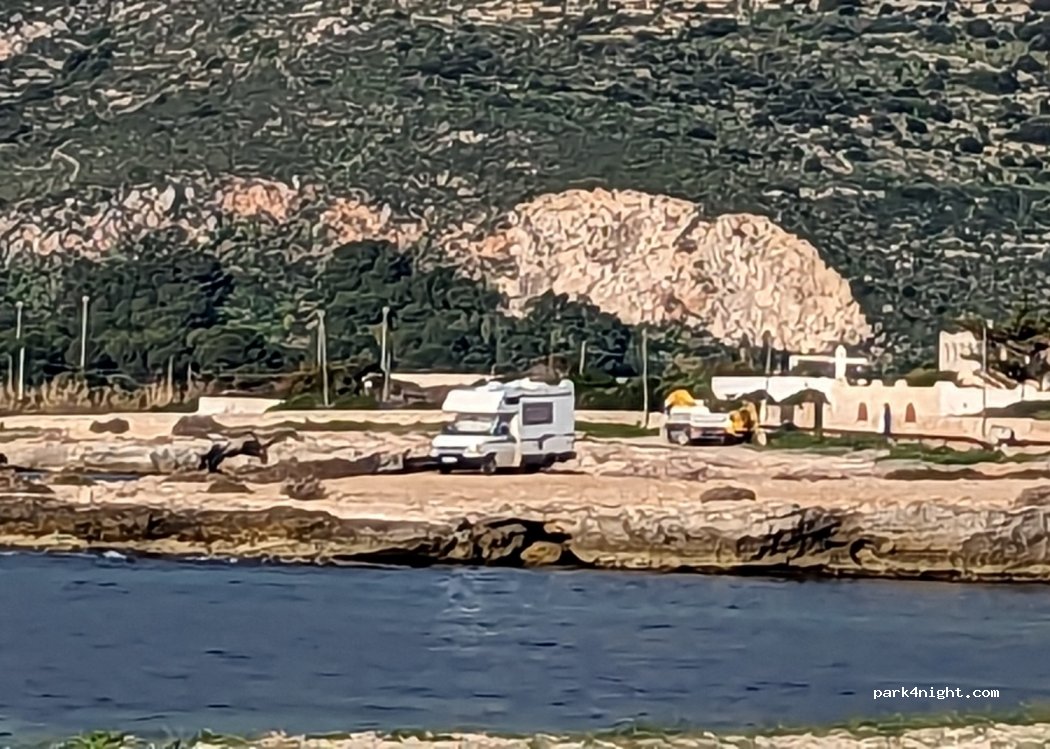 Spazio aperto vicino alla bellissima spiaggia sabbiosa Spiaggia Burrone, raggiungibile a piedi da qui. Sicuramente vale la deviazione! Il parcheggio stesso si trova sulla costa rocciosa. In una tempesta abbastanza alta da poter stare in piedi senza preoccupazioni. Bella vista sul mare e sul Castello di Santa Catarina illuminato di notte.