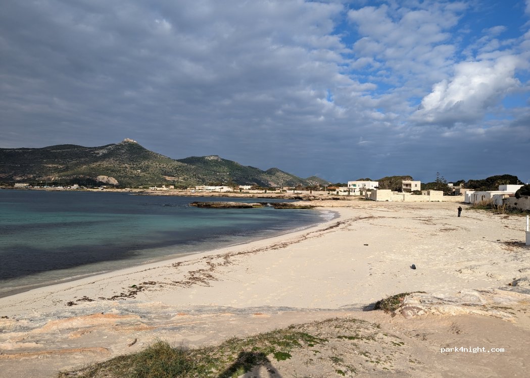 Freifläche in der Nähe des wunderbaren Sandstrands Spiaggia Burrone, der von hier fußläufig erreichbar ist. Auf jeden Fall einen Besuch wert! Der Parkplatz selbst ist an der Felsküste. Bei Sturm hoch genug um sorgenfrei stehen zu können. Wunderschöne Aussicht aufs Meer und das Castello di Santa Catarina, das nachts beleuchtet ist.