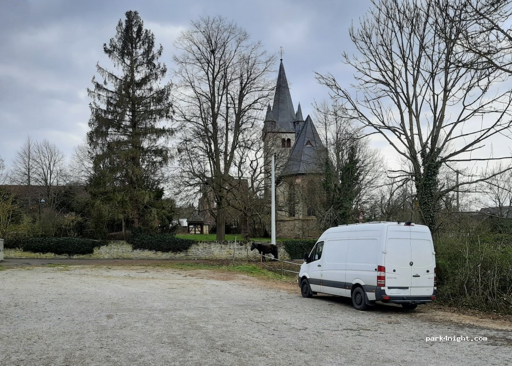 Geschotterter nahezu gerader Parkplatz hinter dem Gemeindezentrum neben einer Koppel. Sehr leise und für eine Nacht top.
