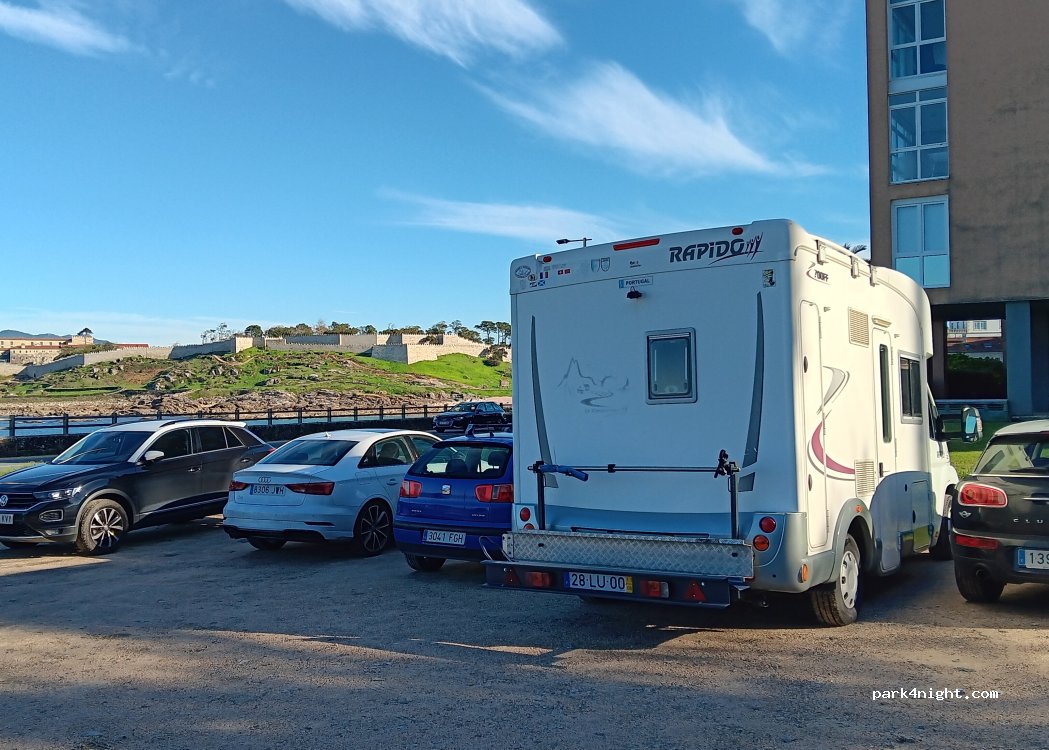 Aparcamiento de tierra justo al borde de la carretera que cruza Baiona. Cuando llueve hay bastante barro y cuentas con que estás a pie de carretera porque a lo mejor hay algo de ruido. Por lo demás, muy cerca caminando del centro y de el castillo.