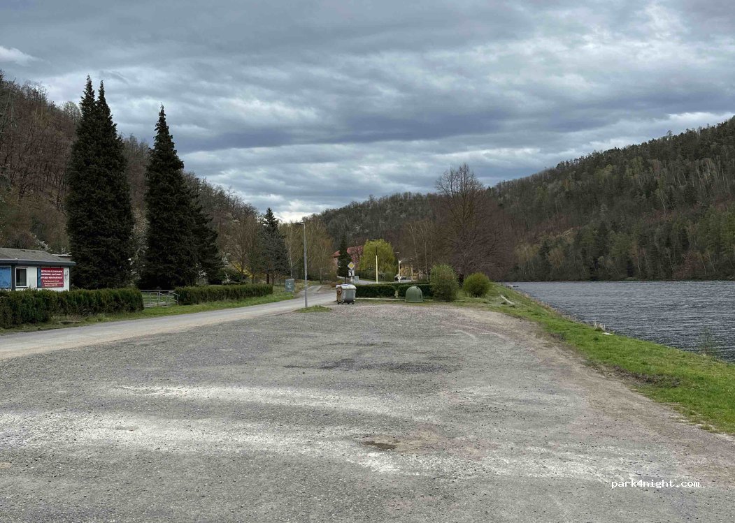 Ruhiger Parkplatz direkt an der Moldau. Ideal für eine Übernachtung. Zwei bewohnte Häuser im Hintergrund vermitteln Sicherheit.