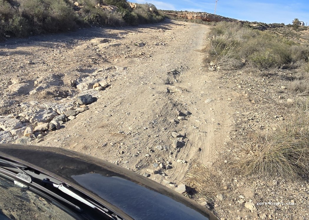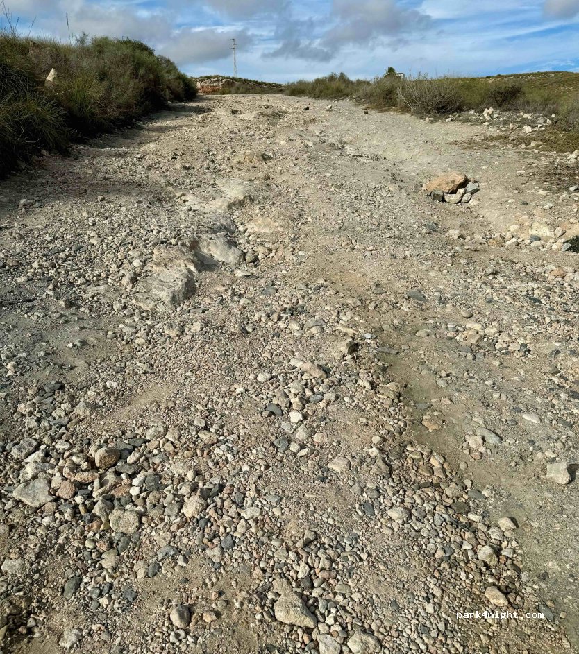 Camino lleno de baches pero factible incluso con dos ruedas motrices. No recomendado para lluvias o precipitaciones recientes. A lo largo de la carretera hay varias zonas llanas donde poder aparcar y la posibilidad de estar en plena naturaleza con acceso a varias calas/playas muy apartadas cercanas