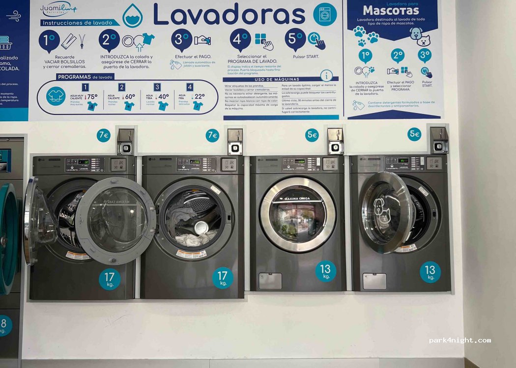 Wäscherei mit 2 Trocknern 2 Waschmaschinen 17 kg und 2 Waschmaschinen 13 kg. Eine der 13-kg-Maschinen ist für Haustiere bestimmt. Geldwechsler. Die Waschmaschinen können auf 22°, 40°, 60° und 75°C eingestellt werden. Vor dem Laden gibt es zwei Verkaufsautomaten für Snacks und Getränke. Vom Wohnmobilstellplatz sind es nur 5 Gehminuten zum Waschsalon