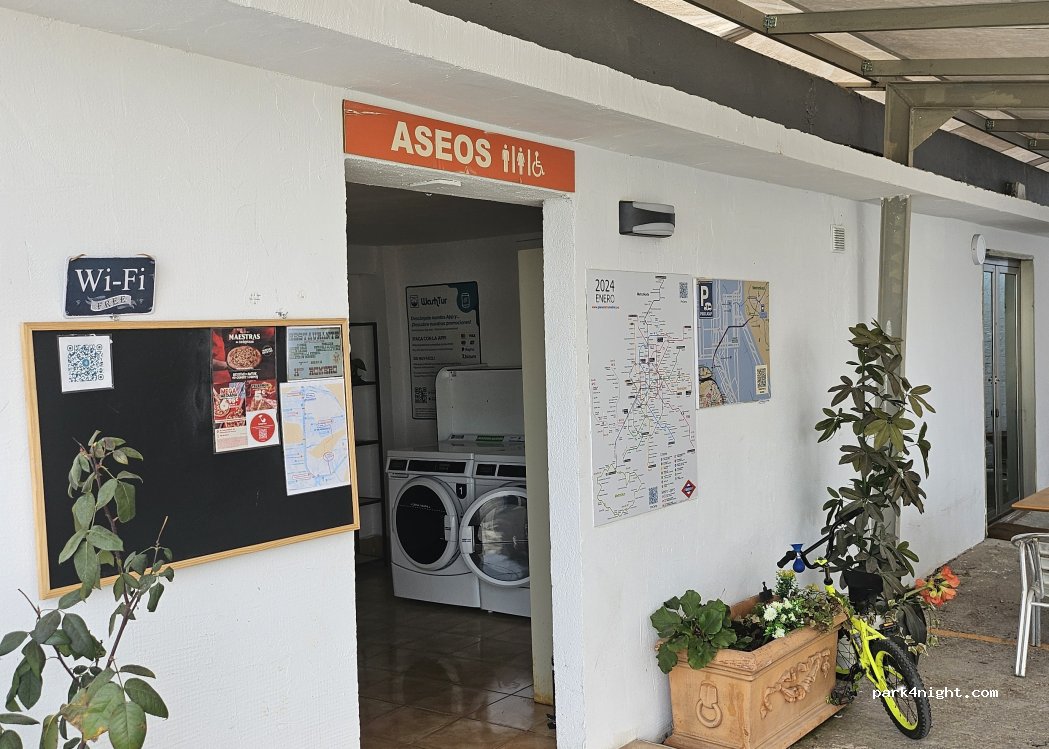 Één van de beste parkeermogelijkheden in Madrid, op slechts 4 km van de luchthaven Barajas-Adolfo-Suárez, naast de handelsbeurs Madrid Ifema. Er is een afvoerpunt voor grijs en zwart water, een wasplaats voor campers, een beveiligde parkeerplaats, mogelijkheden om vers water bij te vullen en een 220V-elektriciteitsaansluiting.