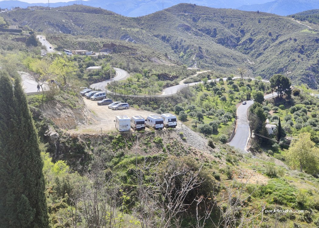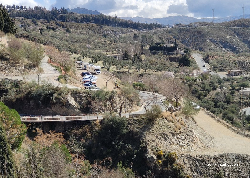 Gran explanada de arena para aparcar, sin servicios ni agua. 5€ por estacionar y pernoctar. Vistas espectaculares de los pueblos de la Alpujarra. Cielo increíble de estrellas. 10min andando al pueblo. Lugar acertado para dejar la autocaravana porque dentro del pueblo no puede pasar y en todos los parkings cobran.