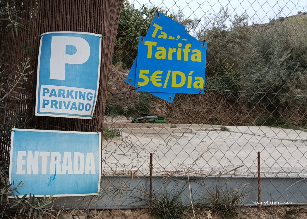 Aparcamiento de tierra privado cerca del pueblo de pago 5€ sin servicios, se puede pecnoctar, pero hay que salir antes de las 9 de la mañana o se paga otro dia de parking.
