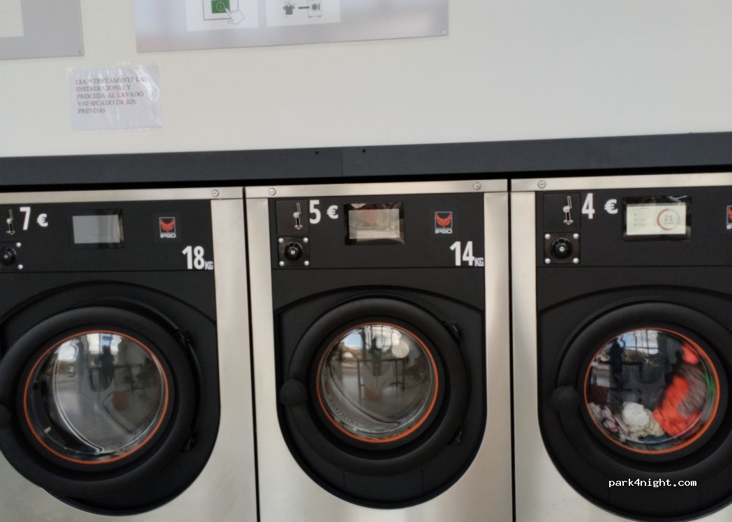 Self-service laundry very close to the motorhome area and with a large esplanade for parking. In front of the gas station