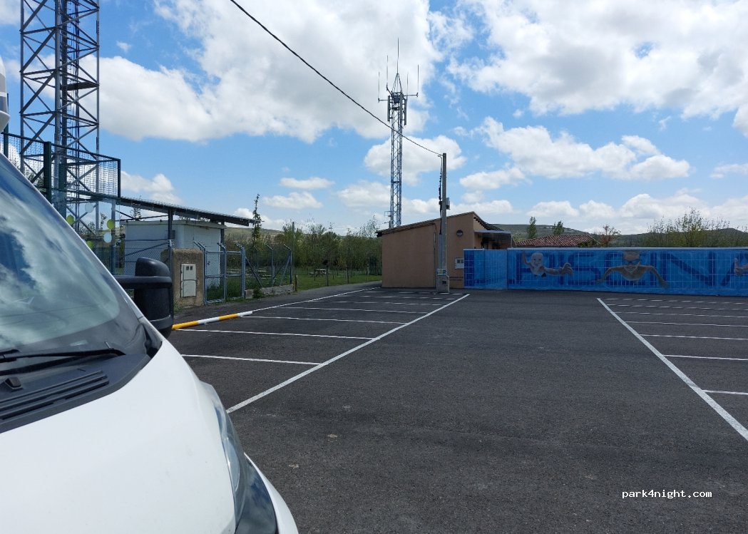 Parking al lado de las piscinas. Nivelado, con varias plazas. Sin servicios. Bueno para un descanso con vistas al pueblo.