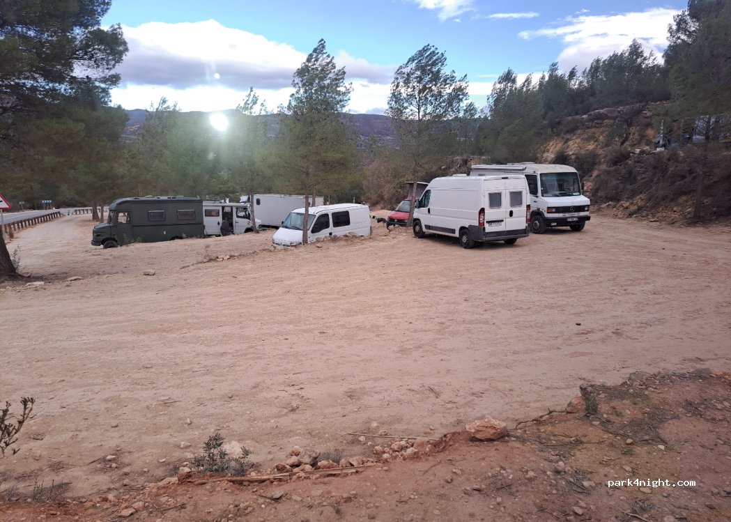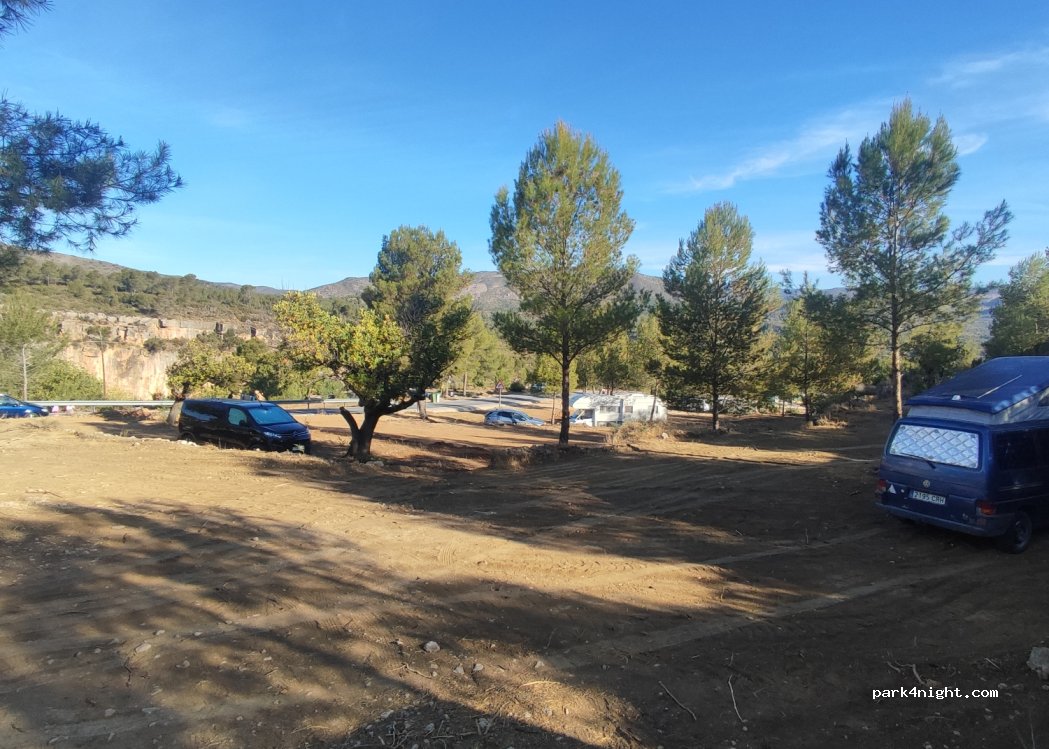 lugar muy tranquilo y al lado del inicio de la ruta de los puentes, perfecto si la quieres hacer en la mañana. Hay sitios en desnivel y sitios con el suelo rectos y no hay problema en pernoctar, pasó la guardia civil por la mañana y no nos dijo nada