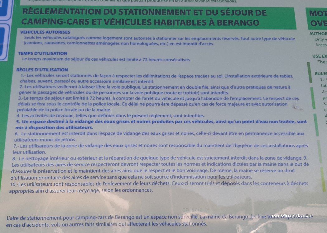 Merci beaucoup à berango pour l'accueil réservé aux camping-cars ! parking assez plat, propre, calme, avec les services nécessaires, poubelles de tri à proximité, restaurant proche, plusieurs supermarchés accessibles par la route ou un sentier (près des vidanges) ... Métro à 400m. aucun reproche !