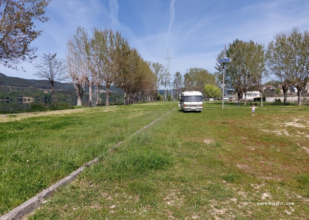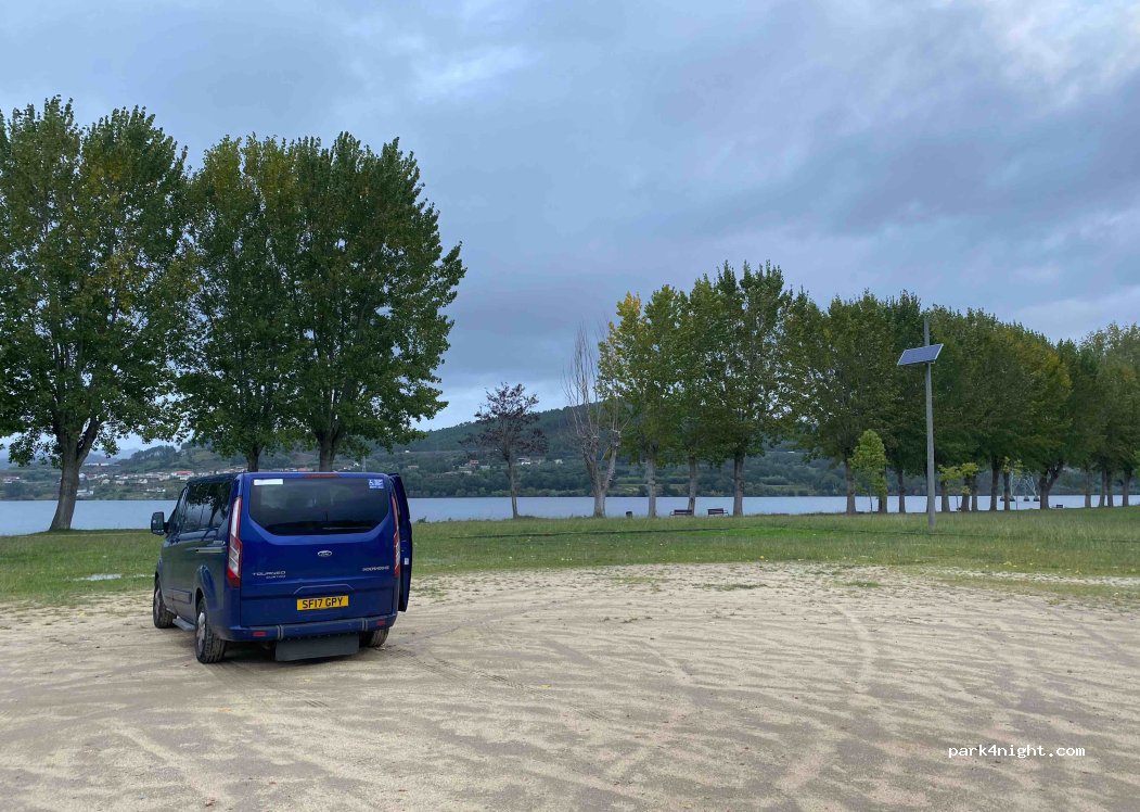 Very large parking area. Totally flat. With rubbish bins every hundred meters, on the banks of the Castrelo de Miño, which is a reservoir with more than seven hundred hectares of water. Very quiet, it has areas with grass and others with fine sand. A nice bar aprox 400 meters from the place.