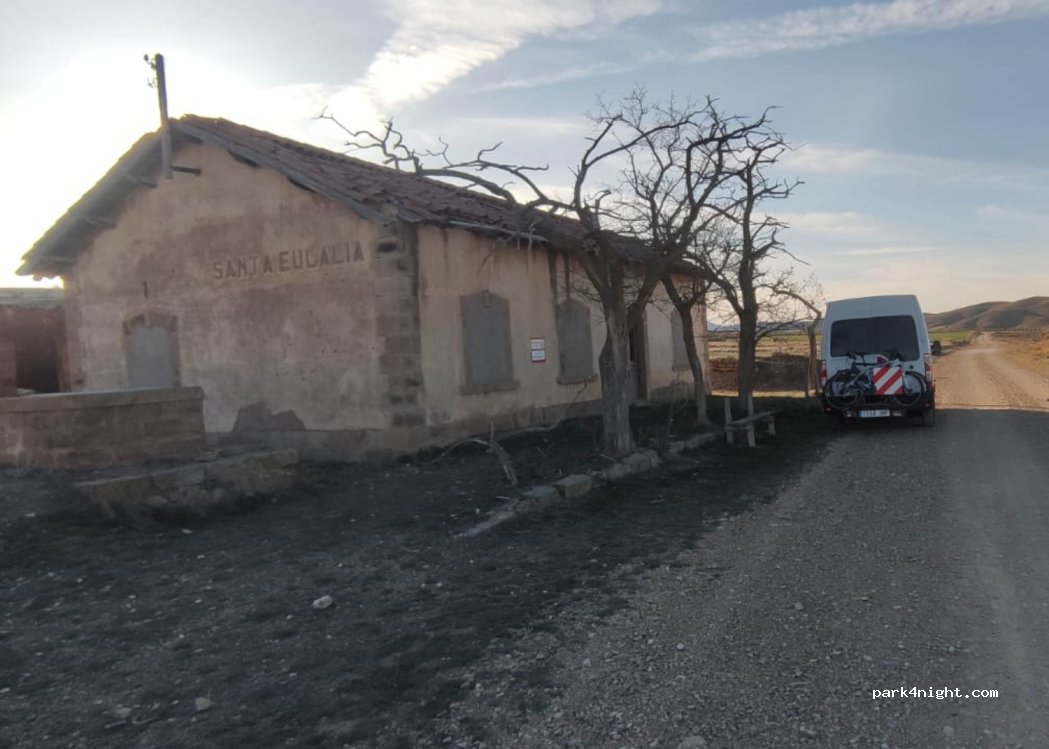 Zona junto a la antigua estación de tren de Santa Eulalia. Al pie de la vía Verde de ojos negros. A 3 km del pueblo de Santa Eulalia. Zona tranquila para pernocta. No tiene servicios.