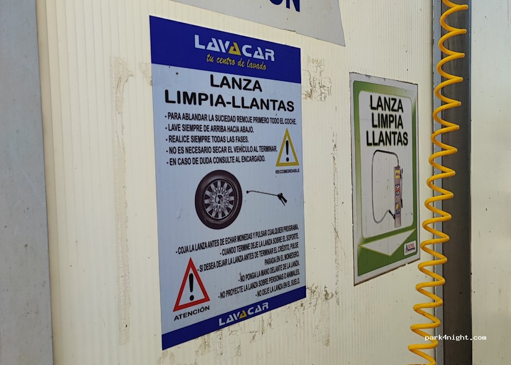 Autolavado a presión para vehículos hasta 3'10 m de altura, con pistola para llantas y plataforma en un lateral para mejor acceso al techo. Funciona con monedas y tiene máquina de cambio de monedas.