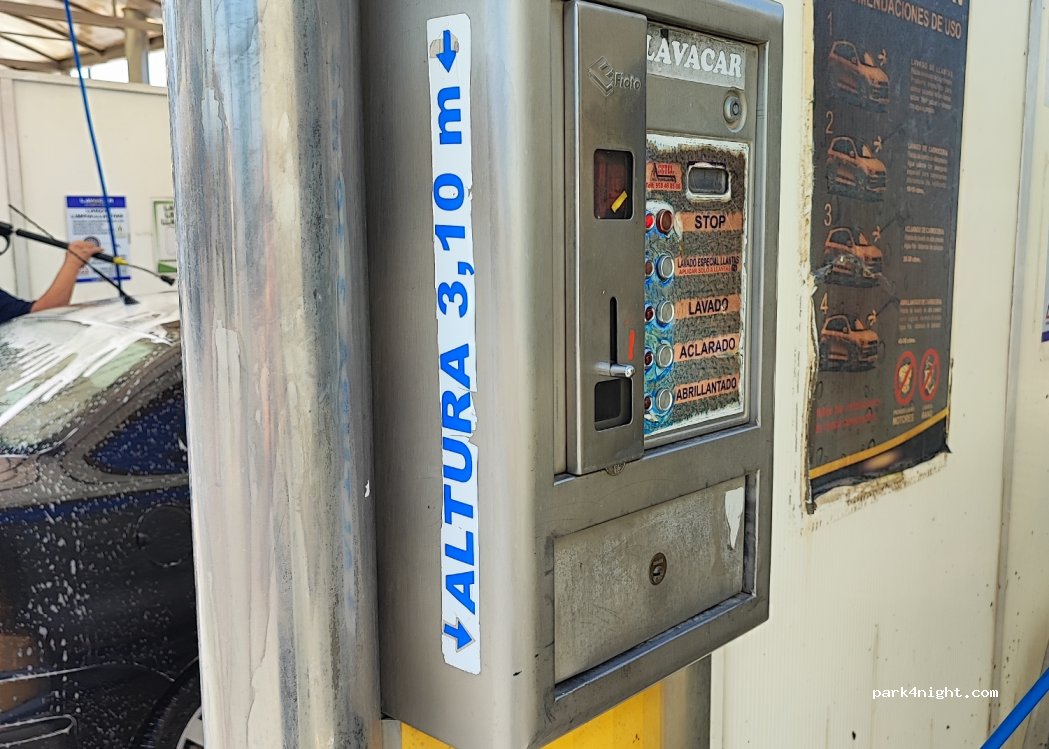 Pressure car wash for vehicles up to 3.10 m high, with a gun for tires and a platform on one side for better access to the roof. It works with coins and has a coin exchange machine.