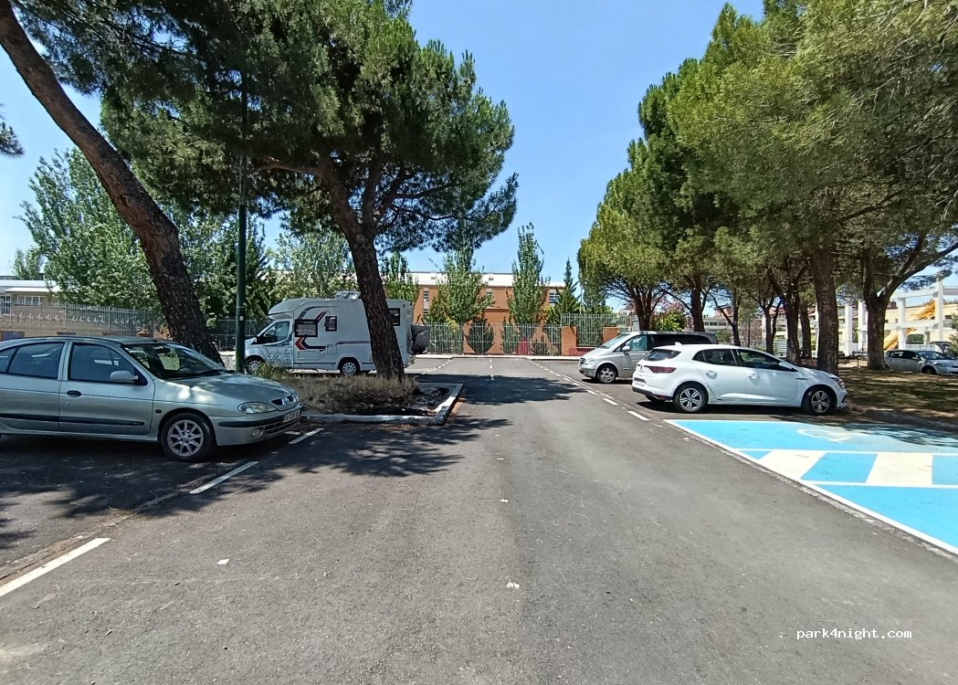 Es un parking tranquilo, está rodeado por pistas deportivas, Extranjería y Hacienda, por lo que hay cámaras y es bastante seguro. Hay algo de sombra y está a escasos metros del paseo fluvial. A unos 800m cruzando el puente hay un Mercadona, bares y restaurantes. Hay carril bici. Los contenedores están en la avenida de arriba y el paseo del río está lleno de papeleras.