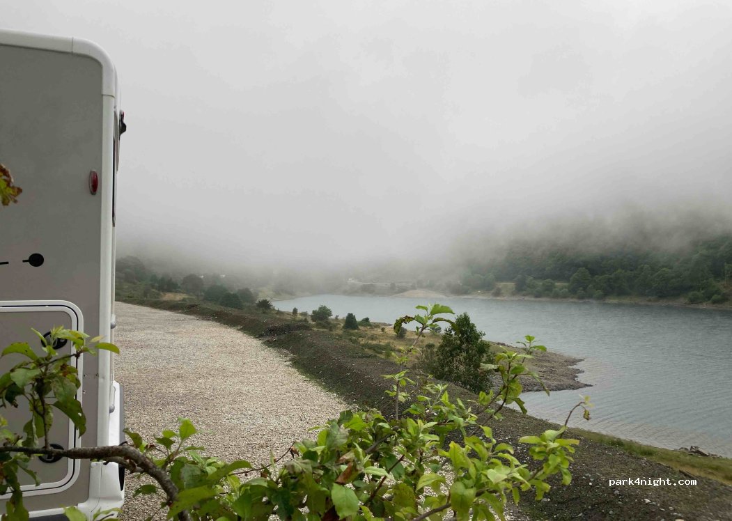 Am Rande des Fabrèges-Sees, nachts geduldet. Wir hatten eine gute Nacht, obwohl die Straße nachts nicht überfüllt war. Hervorragende Aussicht. In diesem See ist Schwimmen oder Wassersport nicht gestattet.