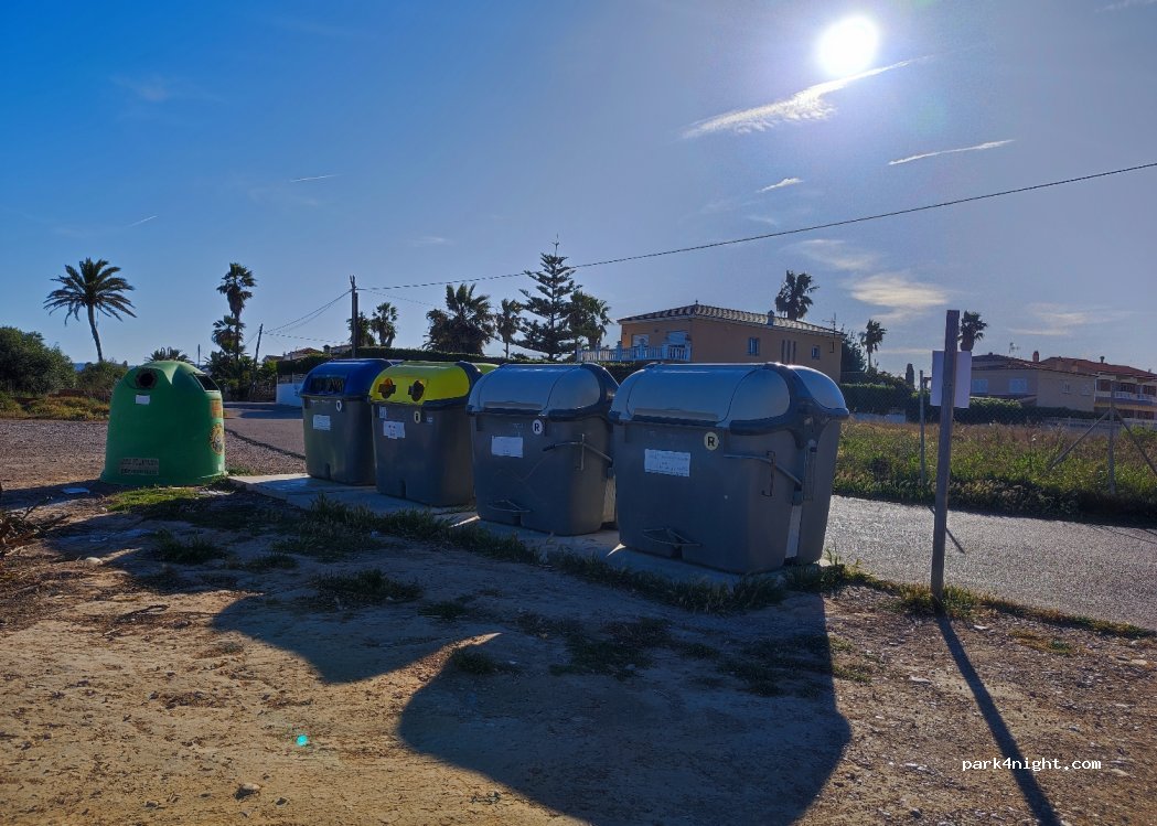 Estacionamiento de grava con contenedores. Increíbles vistas de toda la costa desde Peñíscola hasta Vinaros. Corto paseo a lo largo de la posible costa y la playa de abajo. Lugar tranquilo para pernoctar con cualquier tipo de vehiculo