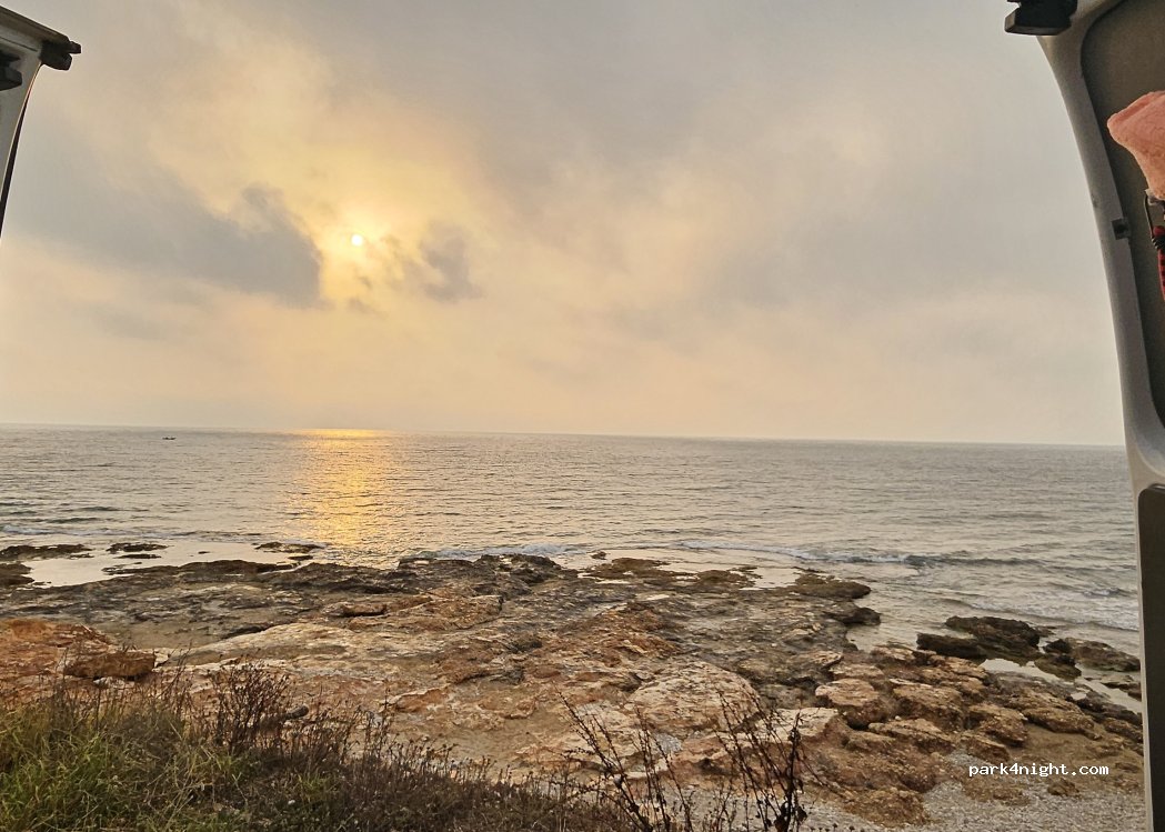 Aparcamiento con buenas vistas, al lado de la playa, con contenedores y sin aglomeraciones. Buena brisa para una siesta de escándalo.