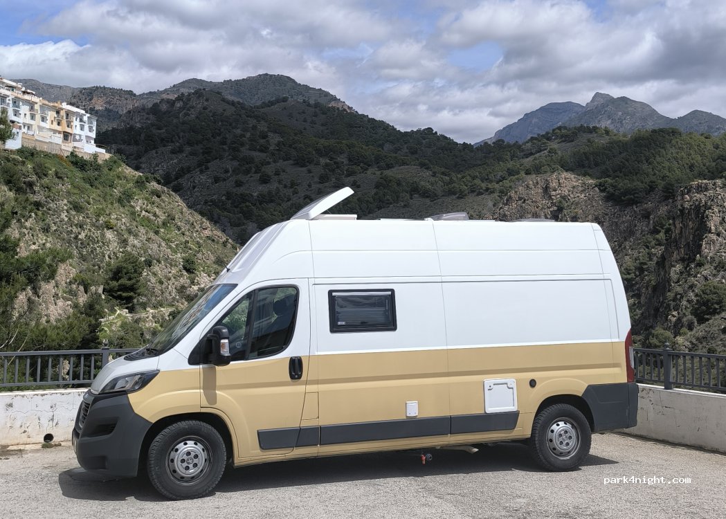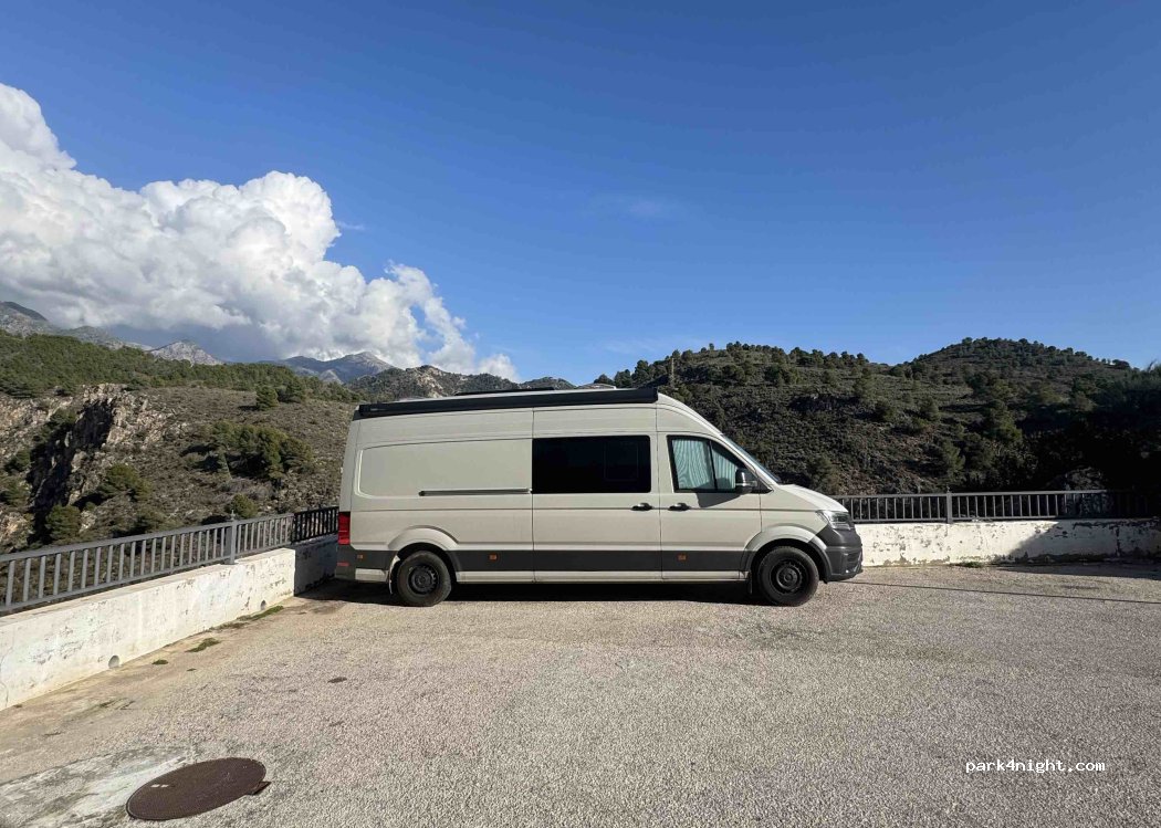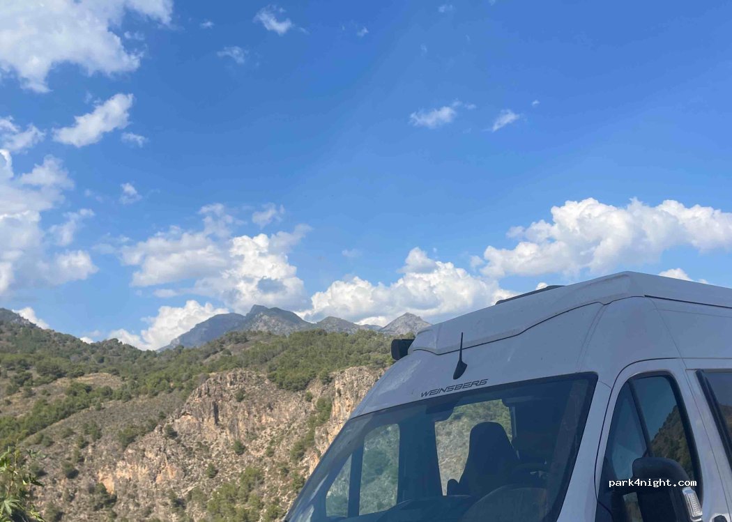 Wat in P4N aangegeven staat als P, is ons inziens de draaicirkel van deze doodlopende weg. Dus hou die vrij en erger de locals niet. Wel kun je hier parallel aan de weg staan. Niet heel charmant, maar het kan. Scheef, vlakbij huizen, zon, direct onder een lantaarnpaal, geen voorzieningen, doodstil. Aan de ene kant huizen en de andere kant bergen.