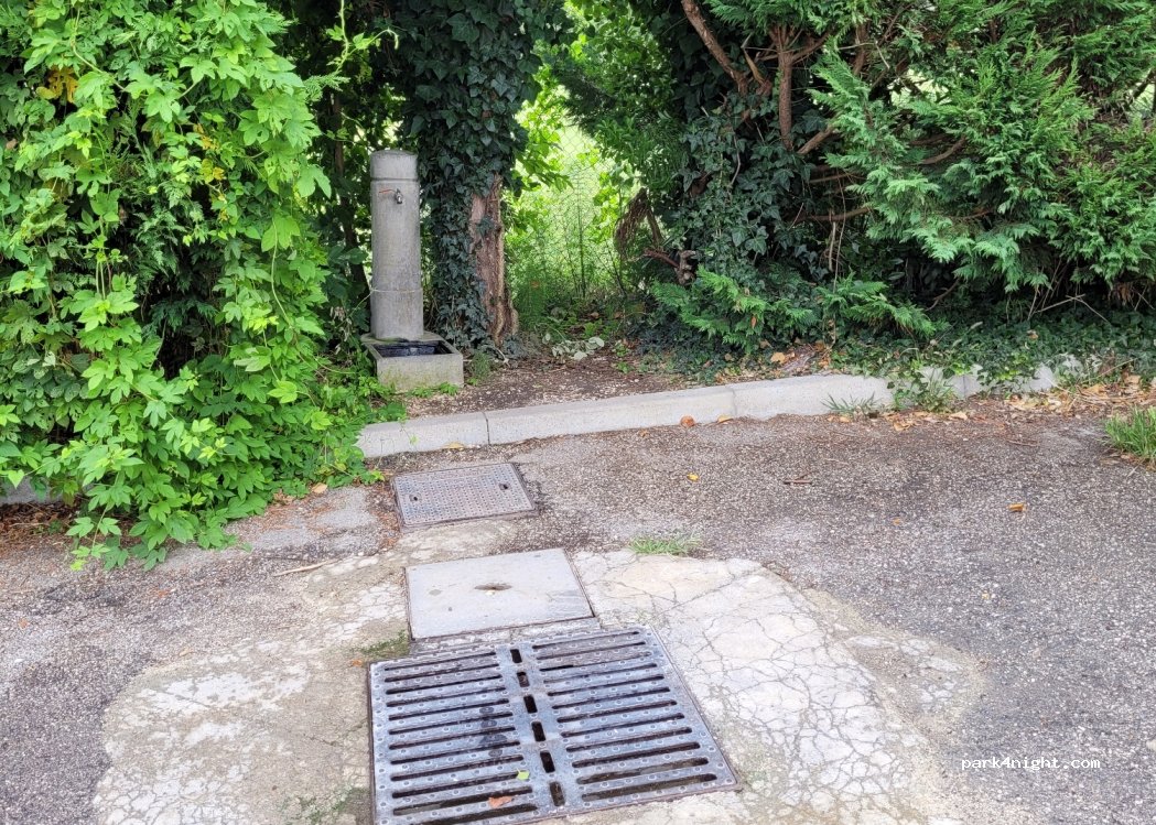 Passati solo per scarico acque grigie/nere. Tombino a cielo aperto. Fontanella per carico e risciacquo cassetta wc. Più avanti parcheggio camper con colonnine ( non testato ). Nel complesso buon posto e pratico carico/scarico.