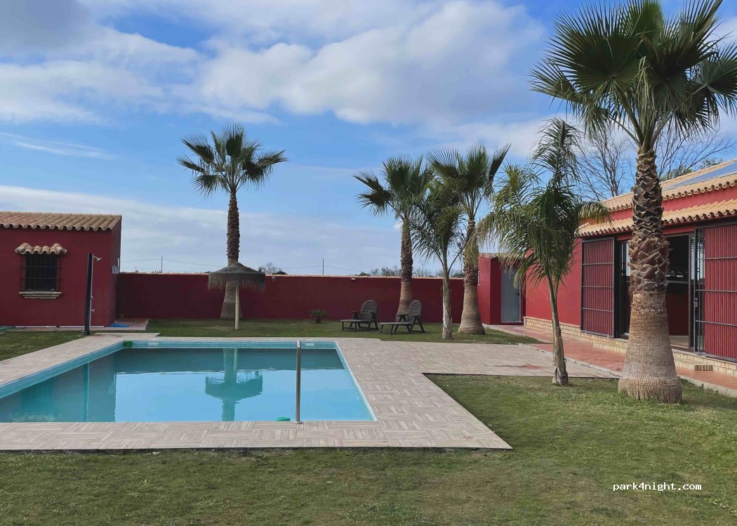 Espacio para pernoctar caravanas, autocaravanas y campers en la carretera Novo Sancti Petri en el término municipal de Conil de la Frontera, con servicios comunes de barbacoa, piscina, aseos, luz y ducha exterior e interior, desagüe de aguas grises y negras.