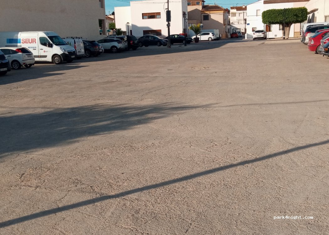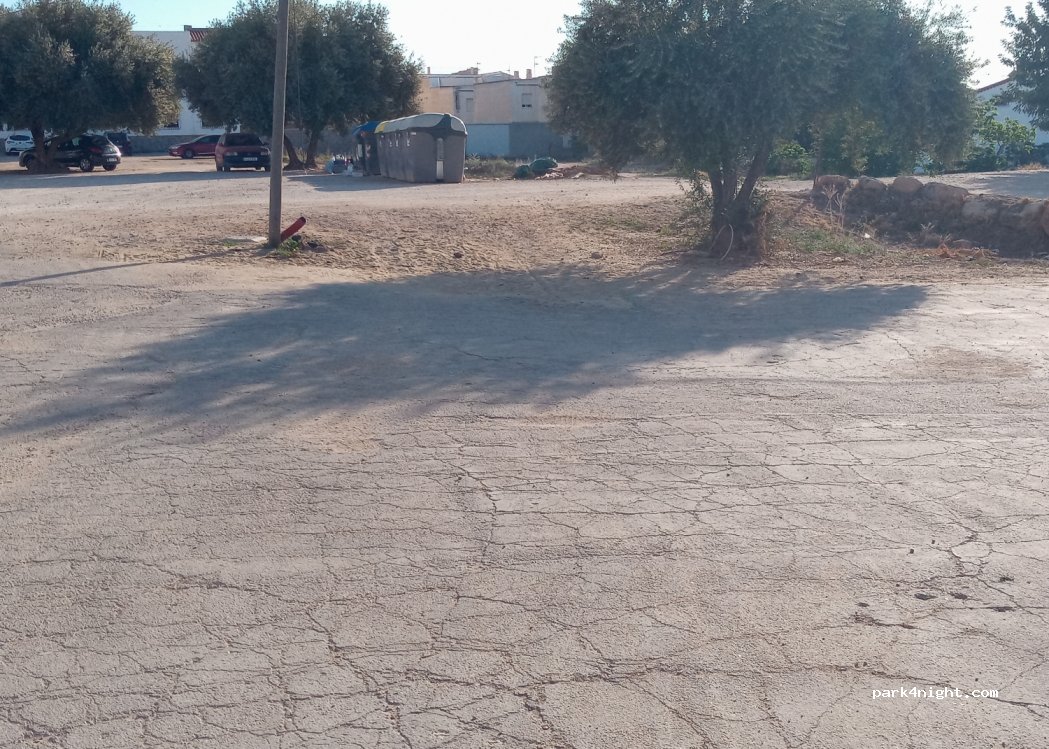 Aparcamiento muy grande, parte en hormigón y parte en tierra. Practicamente llano. Hay contenedores para basura.