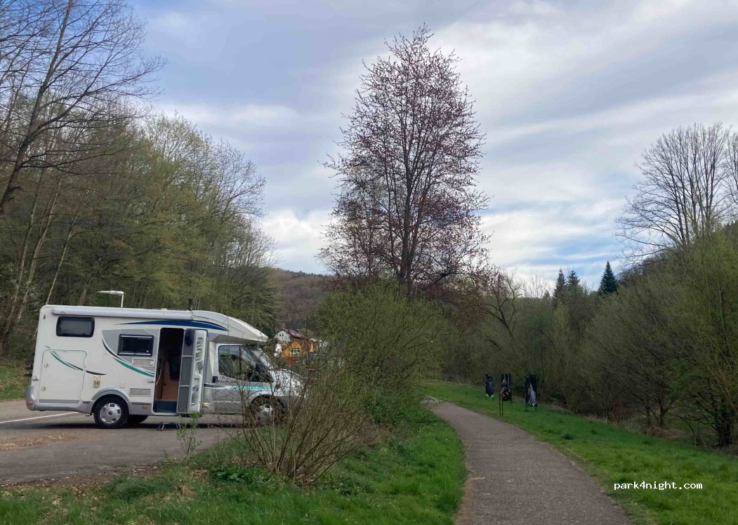 Der asphaltierte Parkplatz ist direkt an der Straße und nicht eben. Zu Fuß 20 min nach Annweiler. Abfallbehälter vorhanden. Ein kleiner Bach direkt nebenan eignet gut zur Kühlung von Getränken. Leider ist der Geräuschpegel der direkt vorbeifahrenden sehr laut. Von den bergauf fahrenden Autos ist sogar die Druckwelle zu spüren. Dar Verkehr in der Nacht ist zwar gering. Aber ab 5 Uhr nimmt er zu.