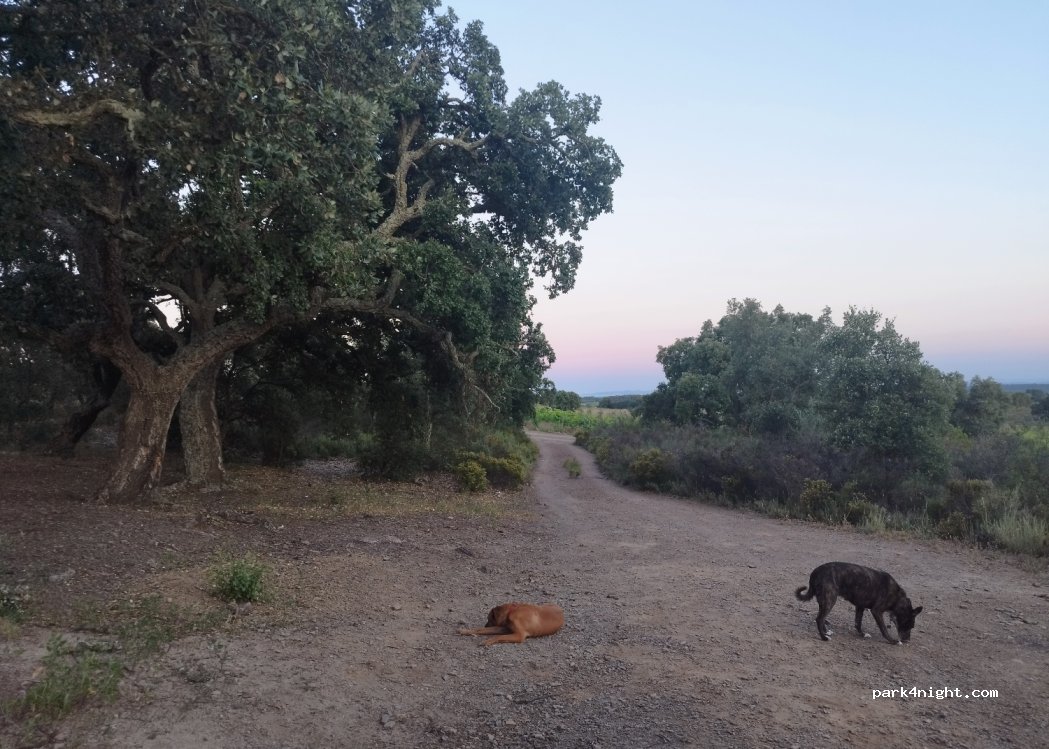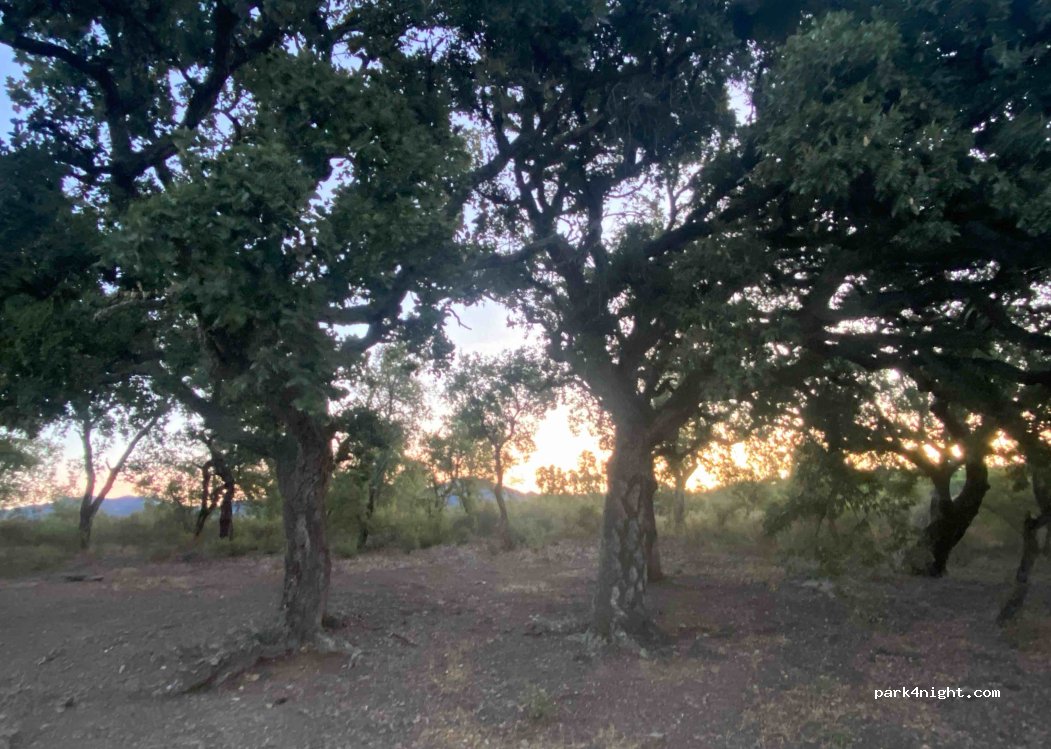 Lugar con sombra apta para dos furgonetas, la carretera está al lado y de vez en cuando escuchas algún coche.