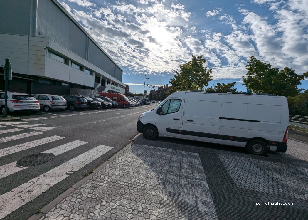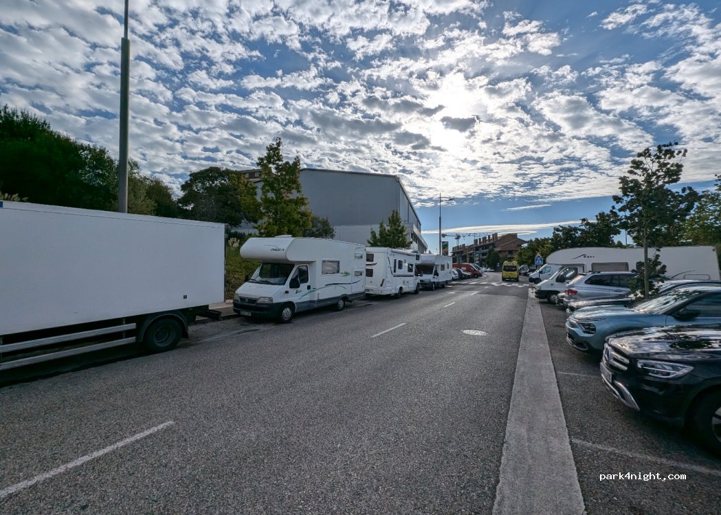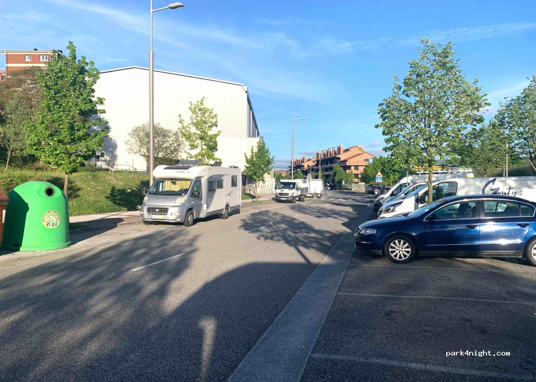 Aparcamiento gratuito. Con sitios disponibles a las 11 a.m. Mi AC de 7 m. salia dos por la acera. Ha estado la policía, y a otro en la misma situación que yo, nos ha dicho que si no ocupavamos más de una plaza, líneas blancas, no había problema. Por la noche debe ser ruidoso por estar junto a la carretera.