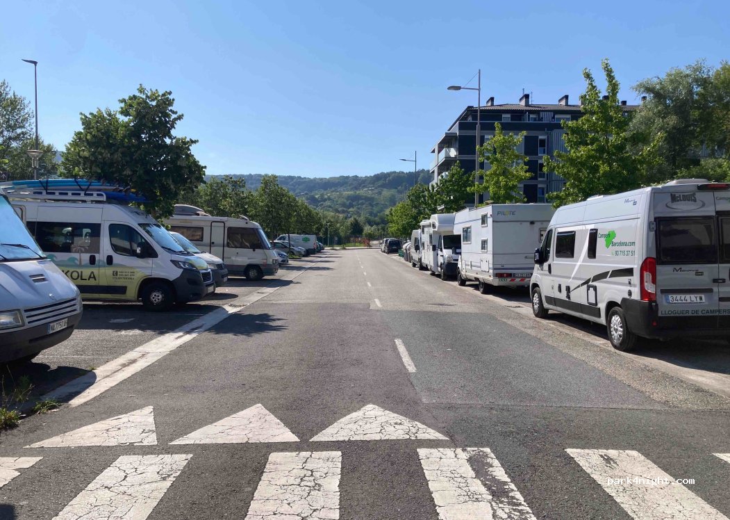 urban roadside parking. plenty of space in early May. plenty of pedestrians walking past. Road quiet, but some road noise from nearby roads. Ideal for visiting Hondarribia.