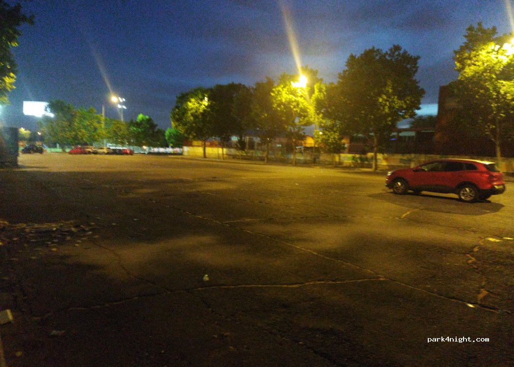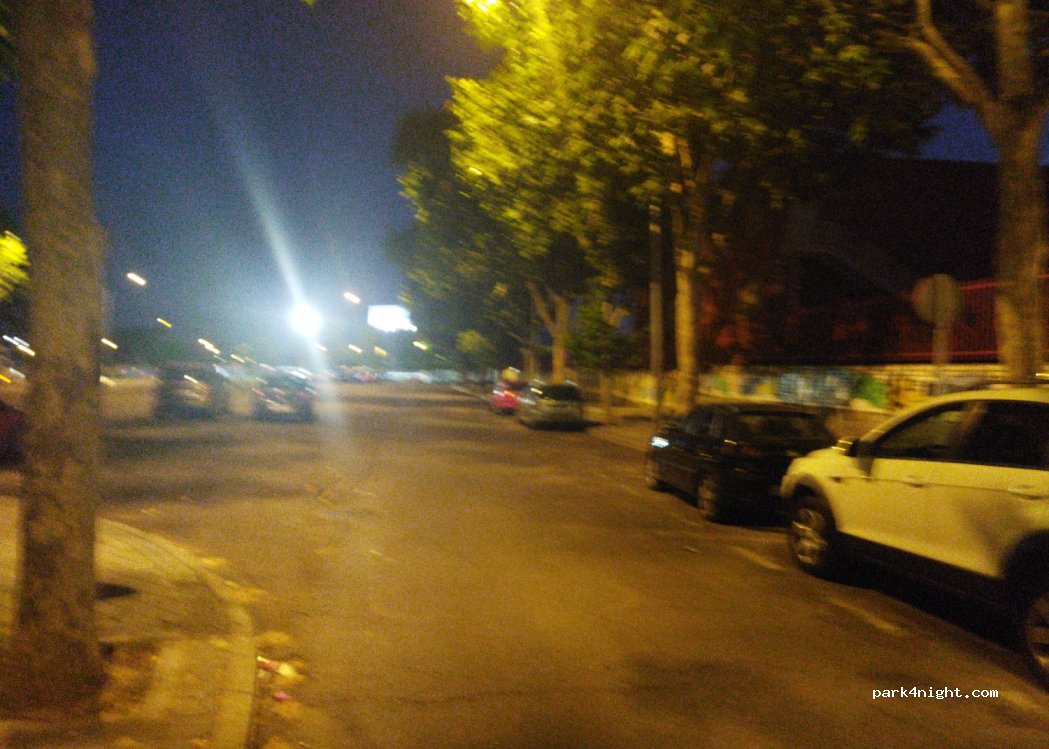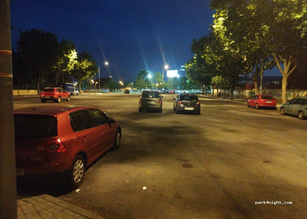 Grand parking goudronné maintenant sans marquage sauf côté droit le long du trottoir. Terrains de sport donc un peu de monde en soirée puis très calme . Excellente nuit. Gare pour Madrid centre à 600 m.