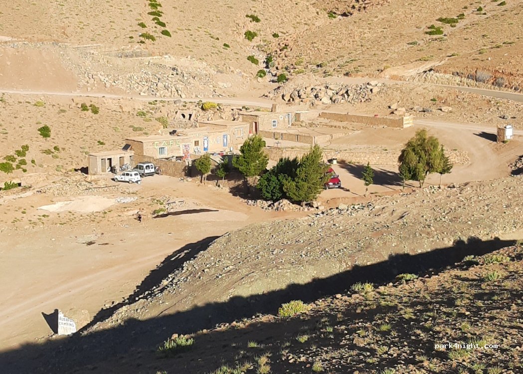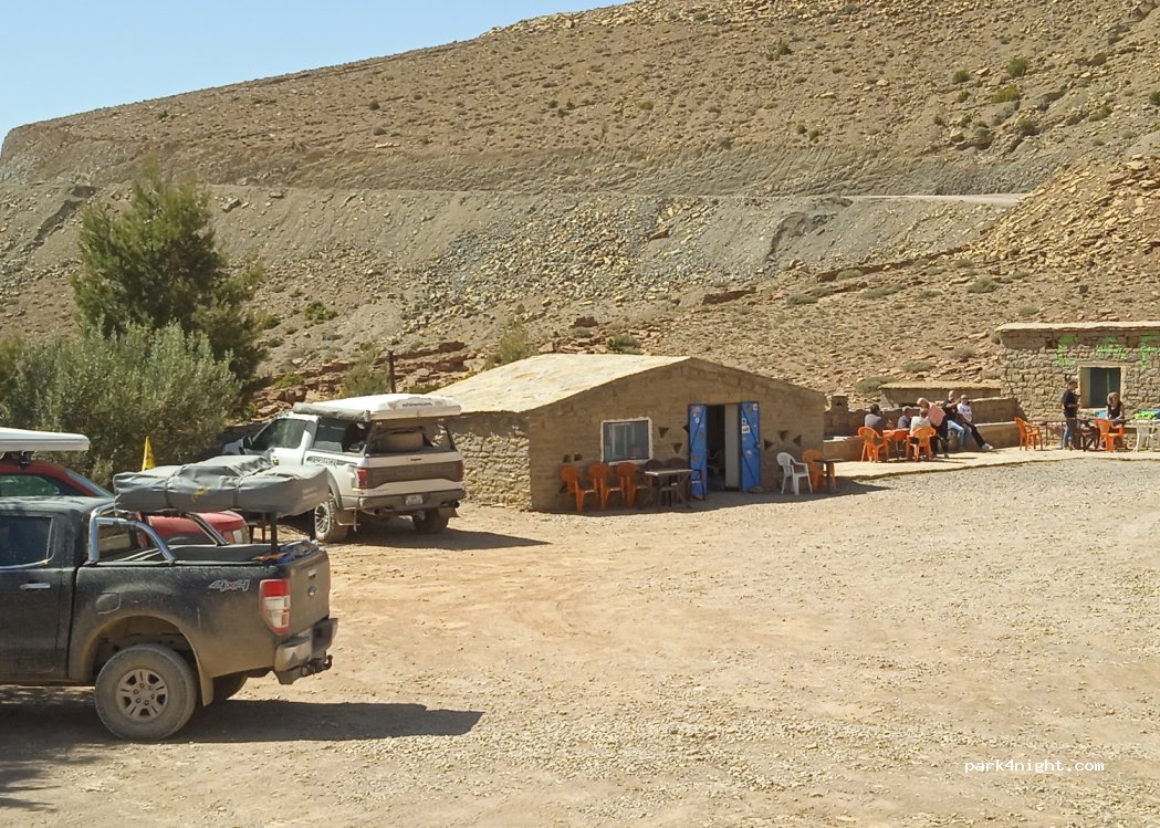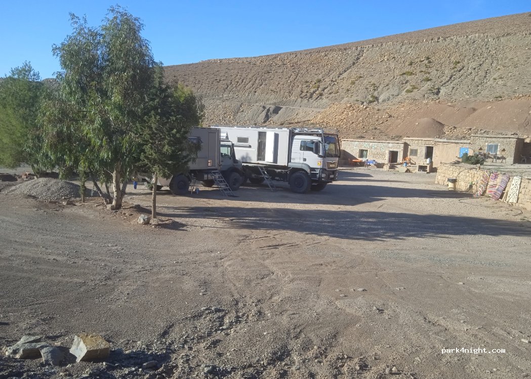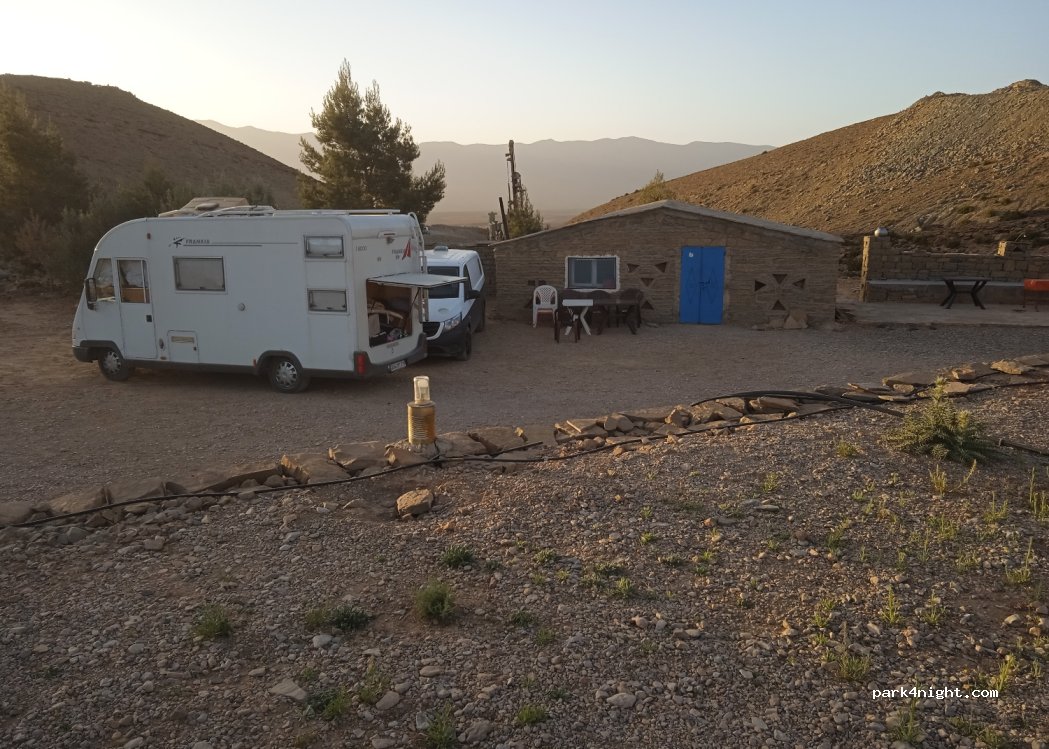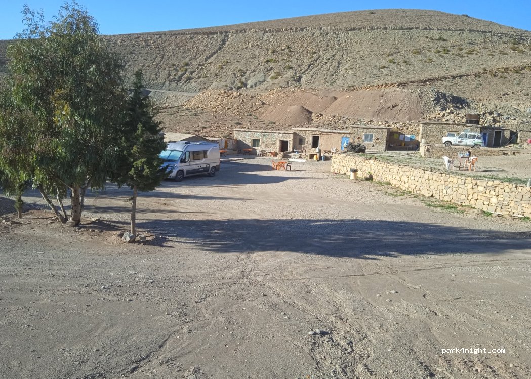 Ruhiger Stellplatz auf 2450m Höhe. Achtung es kann sehr kalt werden. Angrenzende Straße kaum befahren. Essen sehr gut. Dusche kann ich nicht bestätigen, WIFI sporadisch. Wir zahlten für eine Tajine für 2 Personen mit Tee 240 Dirham. Welcher Betrag für das Parken war, hat sich uns nicht erschlossen. Die Räumlichkeiten der Auberge sind sehr gemütlich.