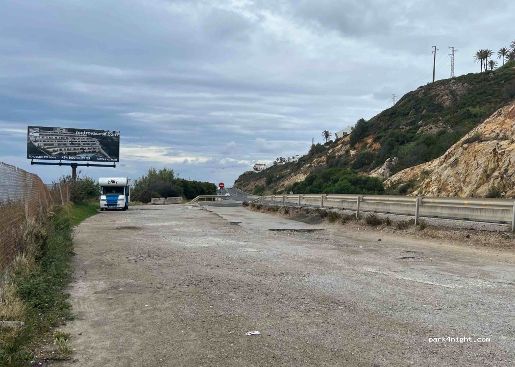 C’est le parking privé d’un restaurant ( A oublier), difficile d’y stationner avec un camping-car !!! De plus, vous êtes vraiment au bord de la voie rapide….je me vois mal y dormir!!!! Un Km plus loin , accès par un rond point à un grand parking en terre, avec vue sur mer, la plage 200m a pied ?! On n’a pas trouvé mieux dans le coin !