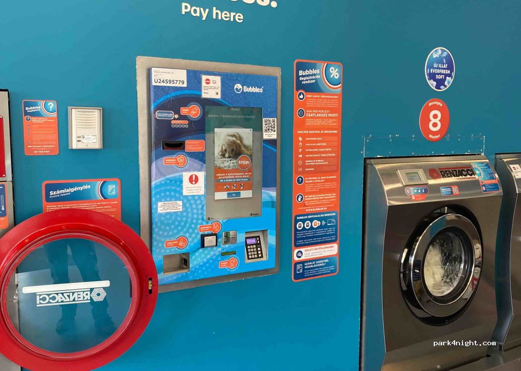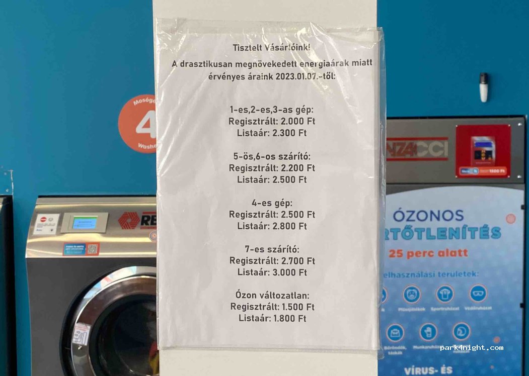 Haben heute hier unsere Wäsche gewaschen, 11 kg für 2400 Ft und getrocknet für 2500 Ft. Alles zu unserer Zufriedenheit, besonders die kurze Wartezeit. Auch wir hatten Glück mit dem Parkplatz direkt vor der Tür.