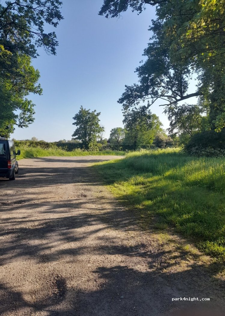 Very quiet spot with a lot of room. Arrived after 8pm and heard a car about every five minutes or so. Mobile network was quite spotty — going from 4G to E now and again, but that could be my network/coverage (TalkMobile/Vodafone). Have a care to mind the large holes in the gravel, though.