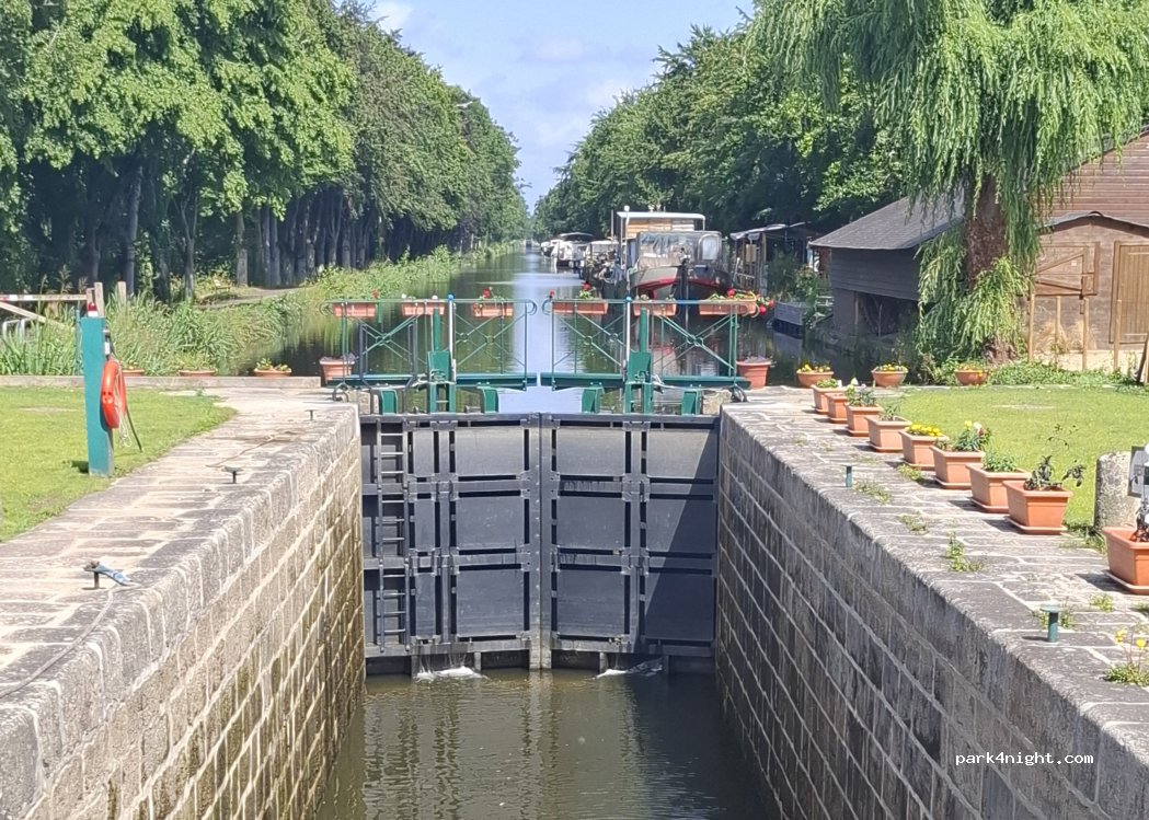 Sympa d'offrir une aire, mais pleine de camping-cars, collés les uns aux autres, en contrebas de l'écluse, donc, sans aucune vue sur le canal. Pour moi, cette concentration est véritablement à fuir, aucun intérêt !