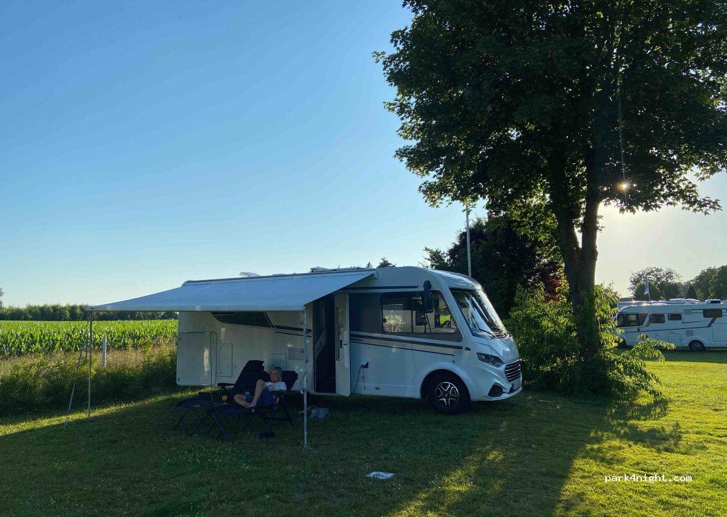 Kleine groene camping. De camperplaatsen zelf zijn niet erg ruim maar OK voor een overnachting. Er stonden ook wat caravans met voortent op deze plaatsen en dan wordt het voor hen wat krap. Elektriciteit voor 1 nacht was 3euro extra.m ( met meter )