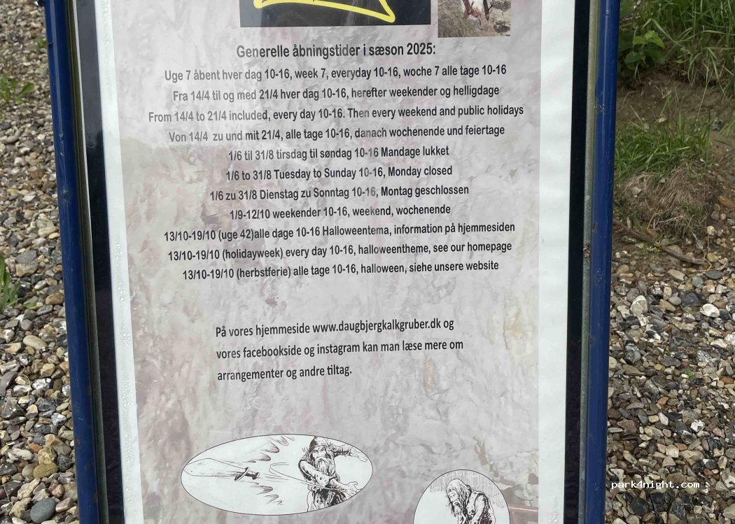 Parking van de kalkgrot in Daugbjerg. Leuke locatie om te bezoeken en van de eigenaar toegestaan om hier te overnachten. Toiletten zijn beschikbaar. Ook is het mogelijk om hier iets te eten en/of te drinken. Je mag er zelfs je eigen lunchpakket opeten.